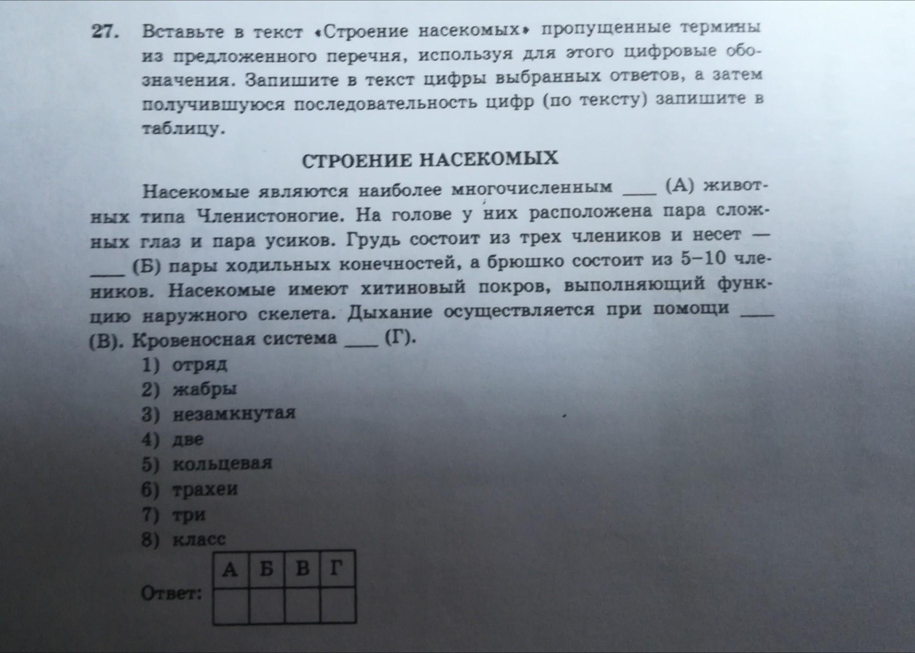 Вставьте в текст "Строение насекомых" пропущенные термины из предложенного перечня, используя для этого цифровые обозначения. Запишите в текст цифры выбранных ответов, а затем получившуюся последовательность цифр (по тексту) запишите в таблицу.