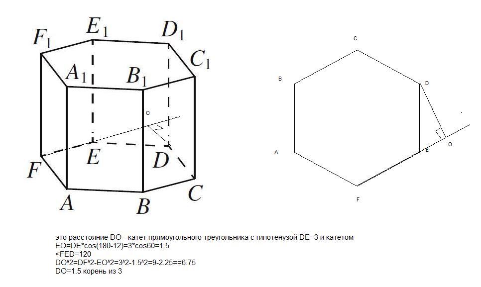 В правильной шестиугольной призме BCDEFA1B1C1D1E1F1 все рёбра равны square root of 3 . Найдите расстояние от точки D до плоскости FEE1.