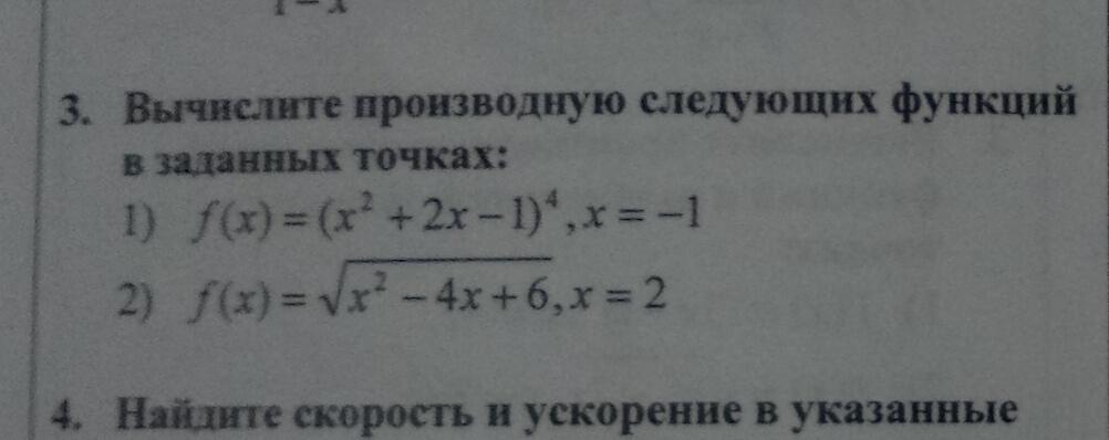1); ; f(x)=(x^2+2x-1)^4\\f'(x)=4(x^2+2x-1)^3cdot (2x+2)\\f'(-1)=4cdot (1-2-1)^2cdot (-2+2)=0\\2); ; f(x)=sqrt{x^2-4x+6}\\f'(x)=frac{1}{2sqrt{x^2-4x+6}}cdot (2x-4)\\f'(2)=frac{1}{sqrt{4-8+6}}cdot (4-4)=0