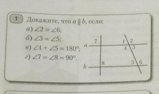 Доказательство: так как углы 2 и 6- соответственные и они равны, то прямые a и b параллельны. (по второму признаку параллельности прямых)