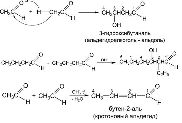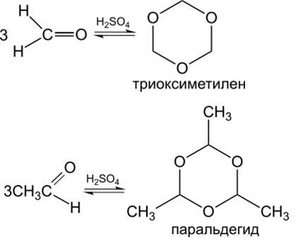 7.2) циклическая: альдегиды самопроизвольно или под действием кислот могут вступать в реакции тримеризации и тетрамеризации, при этом образуются шести- и восьмичленные циклы с чередующимися атомами углерода и кислорода в молекуле (картинка внизу).