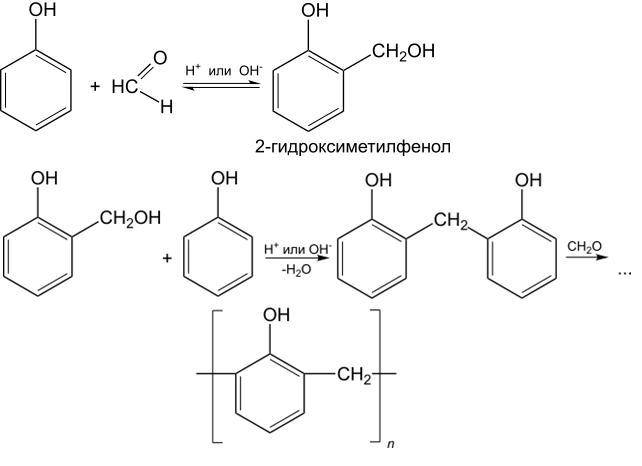8) Поликонденсация: реакции поликонденсации – это процесс образования полимеров из низкомолекулярных веществ, сопровождающийся отщеплением побочных низкомолекулярных веществ – воды, спирта, галогеноводородов и т.д. Альдегиды вступают в реакцию поликонденсации с фенолом (анилином и т.д.) с образованием соответствующих полимерных смол. Реакции протекают ступенчато: сначала образуется димер, затем тример и т.д. (картинка внизу).