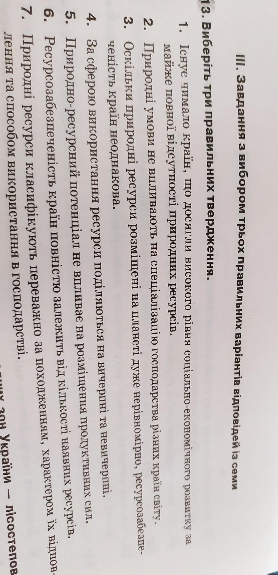 7) Природні ресурси — це сукупність об'єктів та систем живої та неживої природи, компоненти природного середовища, що оточують людину, які використовуються в процесі суспільного виробництва для задоволення матеріальних і культурних потреб людини та суспільства. Природні ресурси класифікують за різними критеріями: приналежністю до тих чи інших компонентів природи (мінеральні, кліматичні, лісові, водні тощо); можливістю відтворення в процесі використання — на вичерпні (поновлювані й непоновлювані) і невичерпні та ін. До природних ресурсів входять сонячна енергія, атмосфера, гідросфера, наземна рослинність, ґрунт, тваринний світ, ландшафт, корисні копалини. Основний напрям освоєння природних ресурсів — їх комплексне використання.
