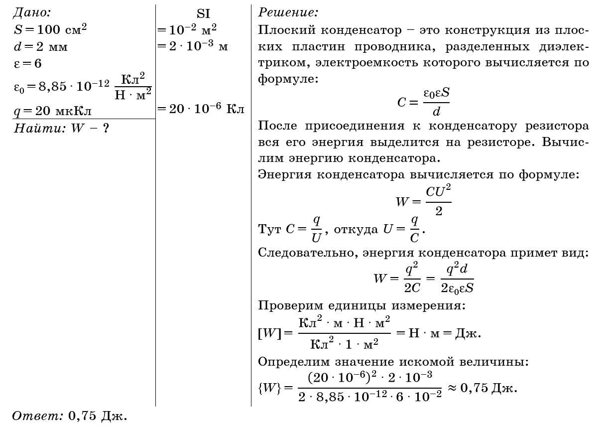 Площадь пластин плоского конденсатора равна S=100 см2, а расстояние между пластинами d=2 мм. Пространство между пластинами конденсатора заполнено слюдой ( = 6). Заряд конденсатора q=20 мкКл. Конденсатор соединяют с резистором. Какая энергия выделится на резисторе к моменту полной разрядки конденсатора?
