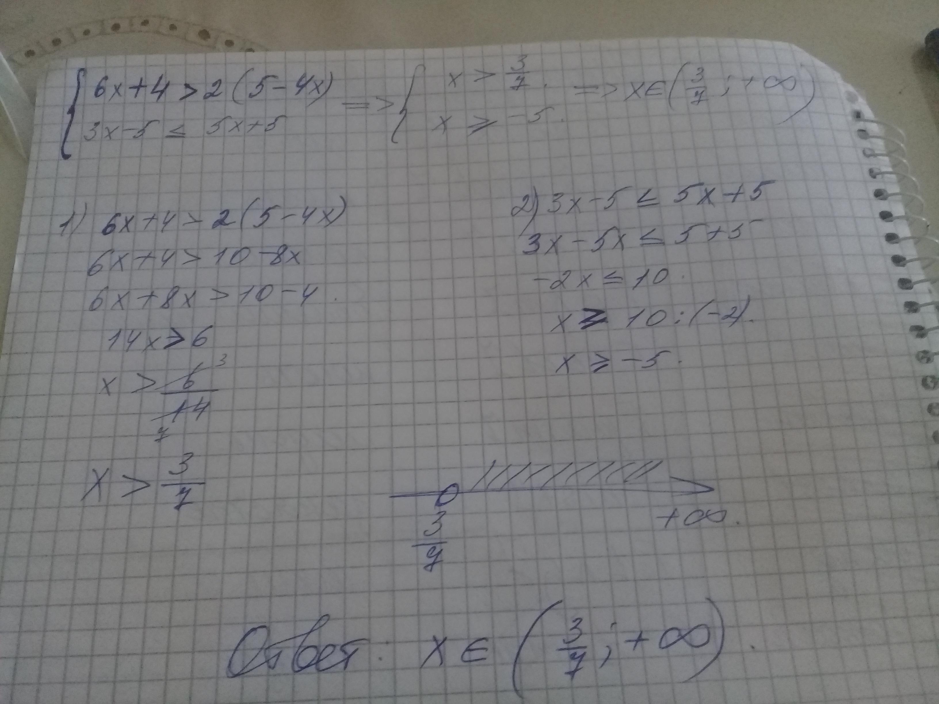 Объяснение:{6x+4>10-8x, 3x-5x≤5+5;