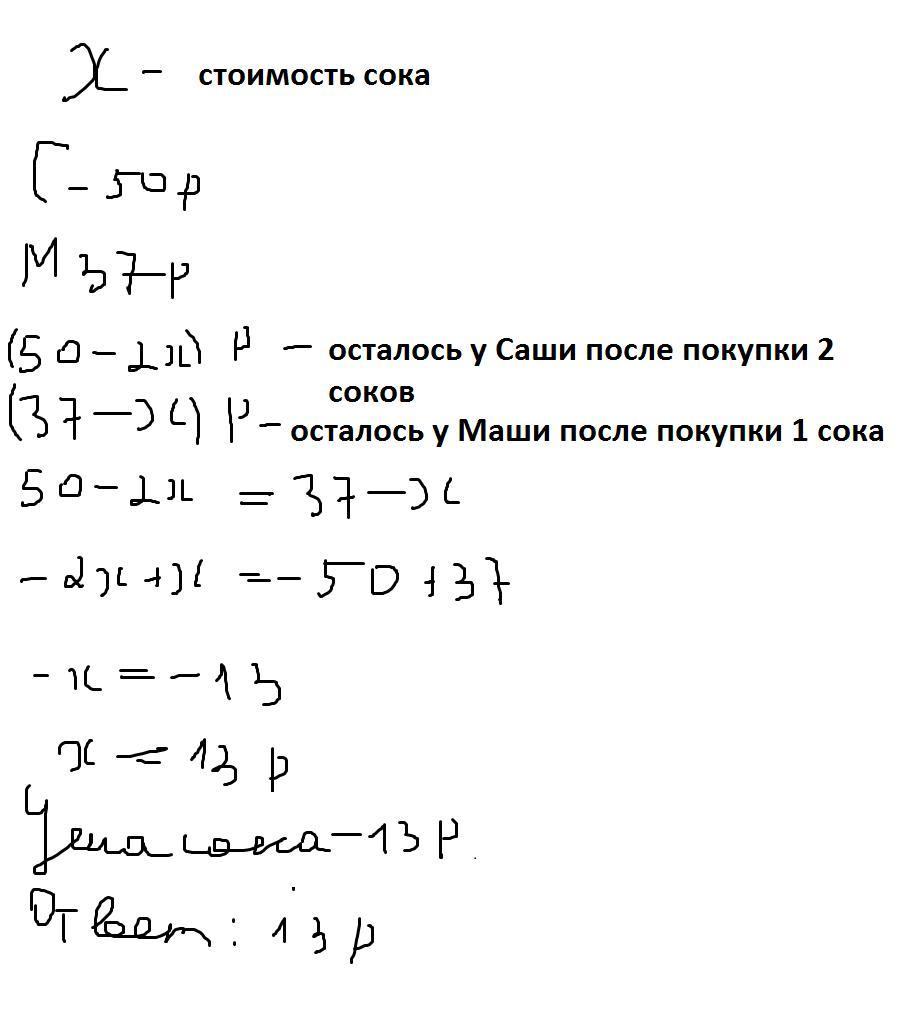 У Саши было 50 руб, а у Маши 37 руб .После того как Саша купила Два сока ,а Маша один такой же сок ,денег у них стало поровну. Сколько стоит один сок?