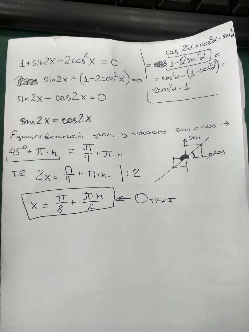 использована формула косинуса двойного угла(справа сверху выписала её отдельно). В ответе не очень уверена, если честно
