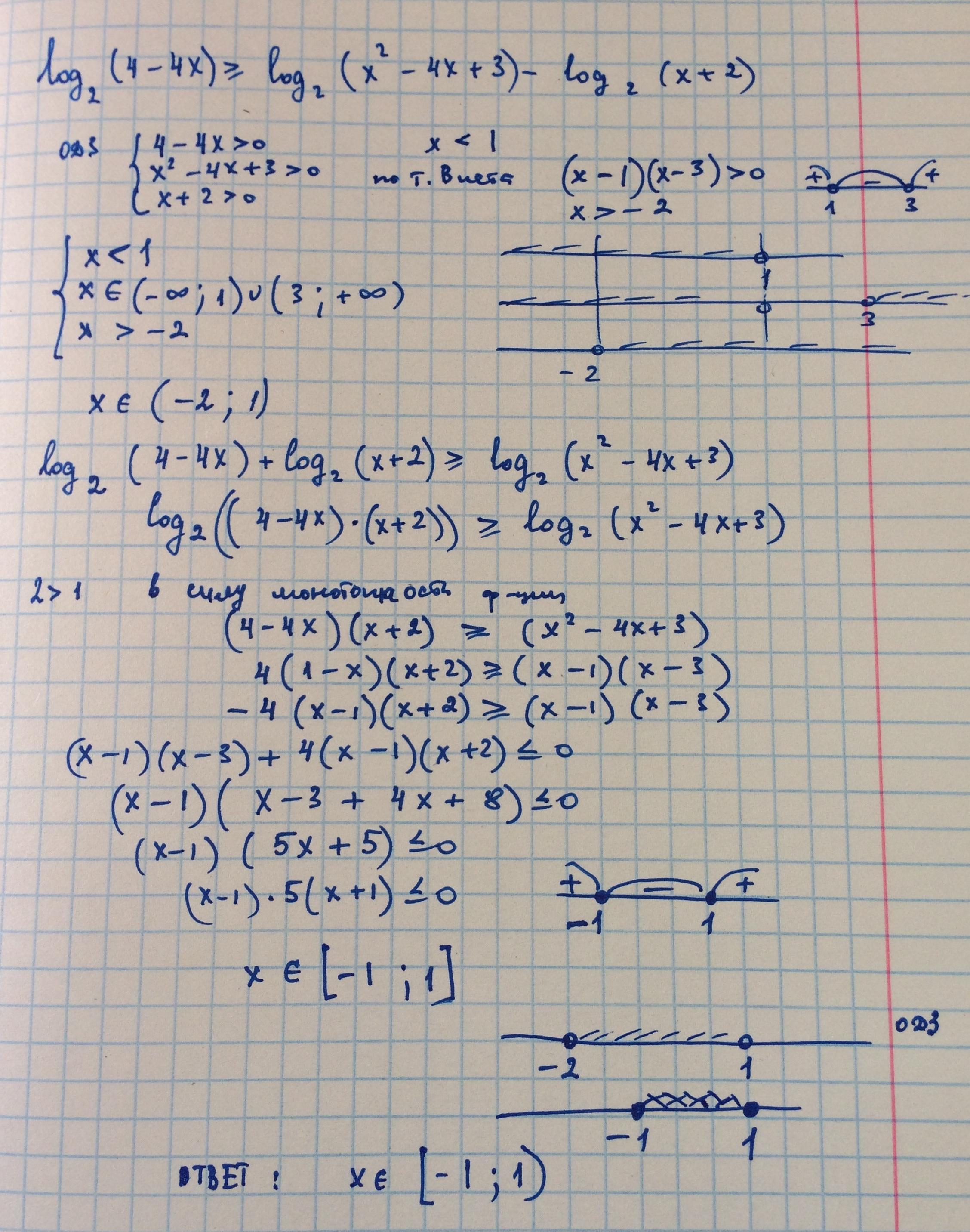Спасибо за решение! Подскажите, почему нельзя было идти так: log2 (4-4x) >=log2 ((x^2-4x+3)/(x+2))