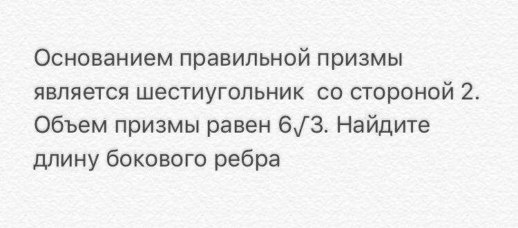 V=S(осн)*H, 6V3=6V3*H, H=1, боковое ребро=1