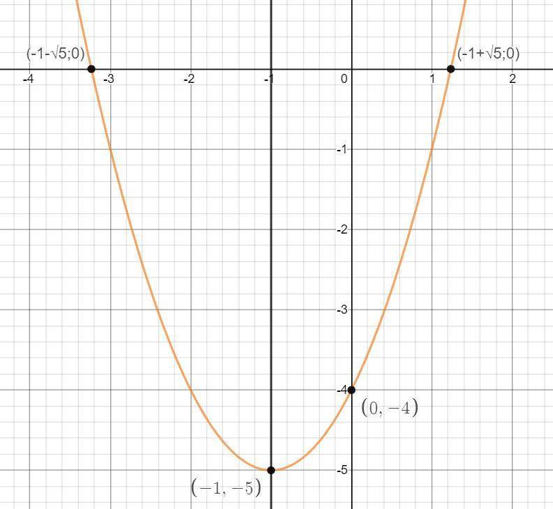 Это парабола, ветви которой направлены вверх, координата вершины (-1;-5). Точки пересечения с осями координат: (0;-4),(-1-√5;0)(-1+√5;0).