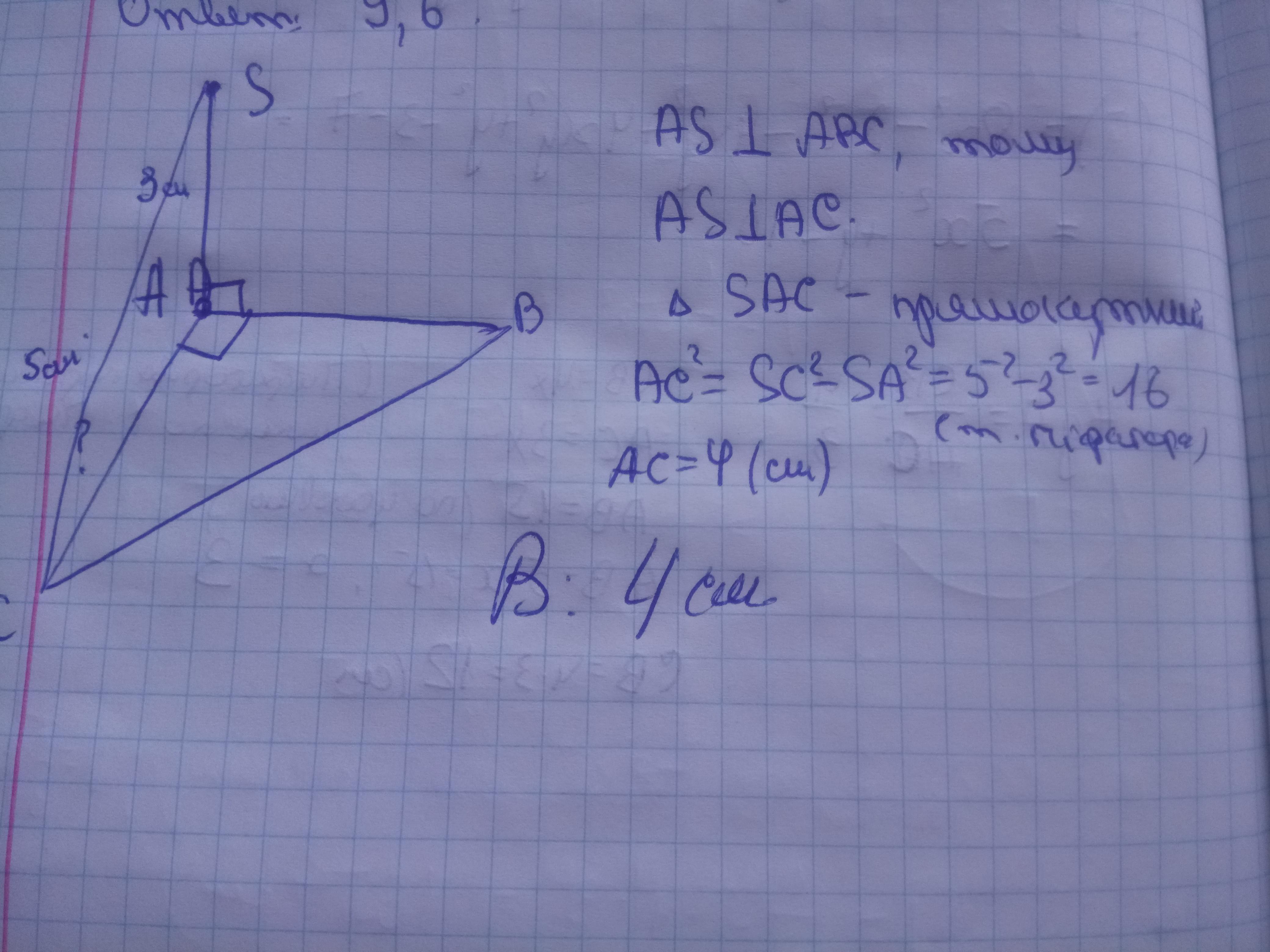 Відрізок АS перпендикулярний до площини трикутника АВС. Знайдіть відстань від точки А до точки С, якщо SA=3 см SC=5 см