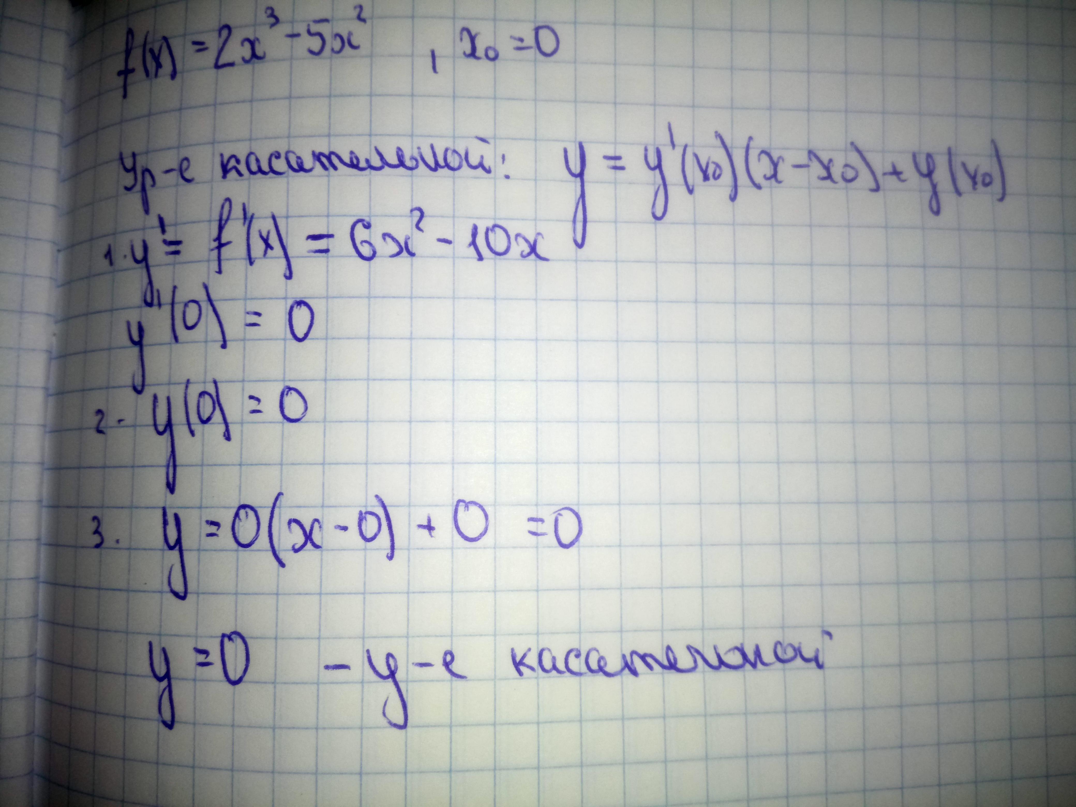 y=f(xо)+f'(xо)(x-xо), f(0)=0, f'=6x^2-10x, f'(0)=0, уравнение касательной