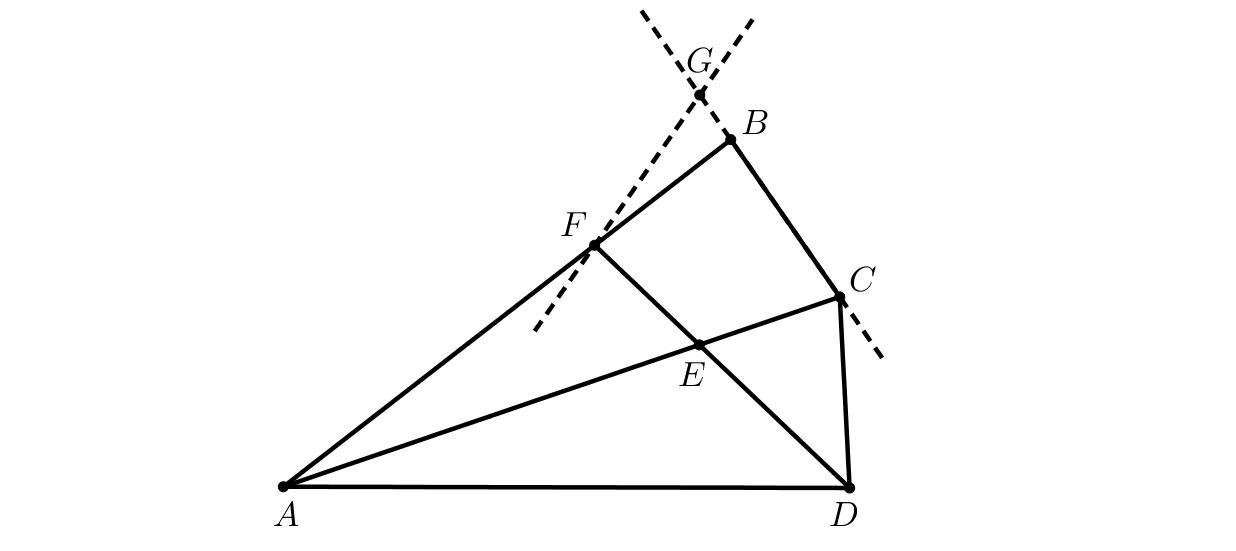 В четырёхугольнике ABCD выполнены равенства AB=AD и BC=CD. Биссектриса угла D пересекает диагональ AC в точке E, а сторону AB — в точке F. Прямая, симметричная AB относительно прямой FD, пересекает прямую BC в точке G. Выберите несколько точек, 3 из которых являются вершинами треугольника, а остальные — его центром (или центрами) вневписанной окружности (окружностей).