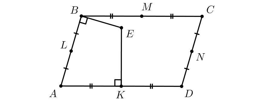 Точки K, L, M, N являются серединами сторон AD, AB, BC, CD параллелограмма ABCD. Перпендикуляры к сторонам AB и AD, восстановленные соответственно из точек B и K, пересекаются в точке E. Выберите 4 точки, являющиеся вершинами треугольника и его ортоцентром соответственно.