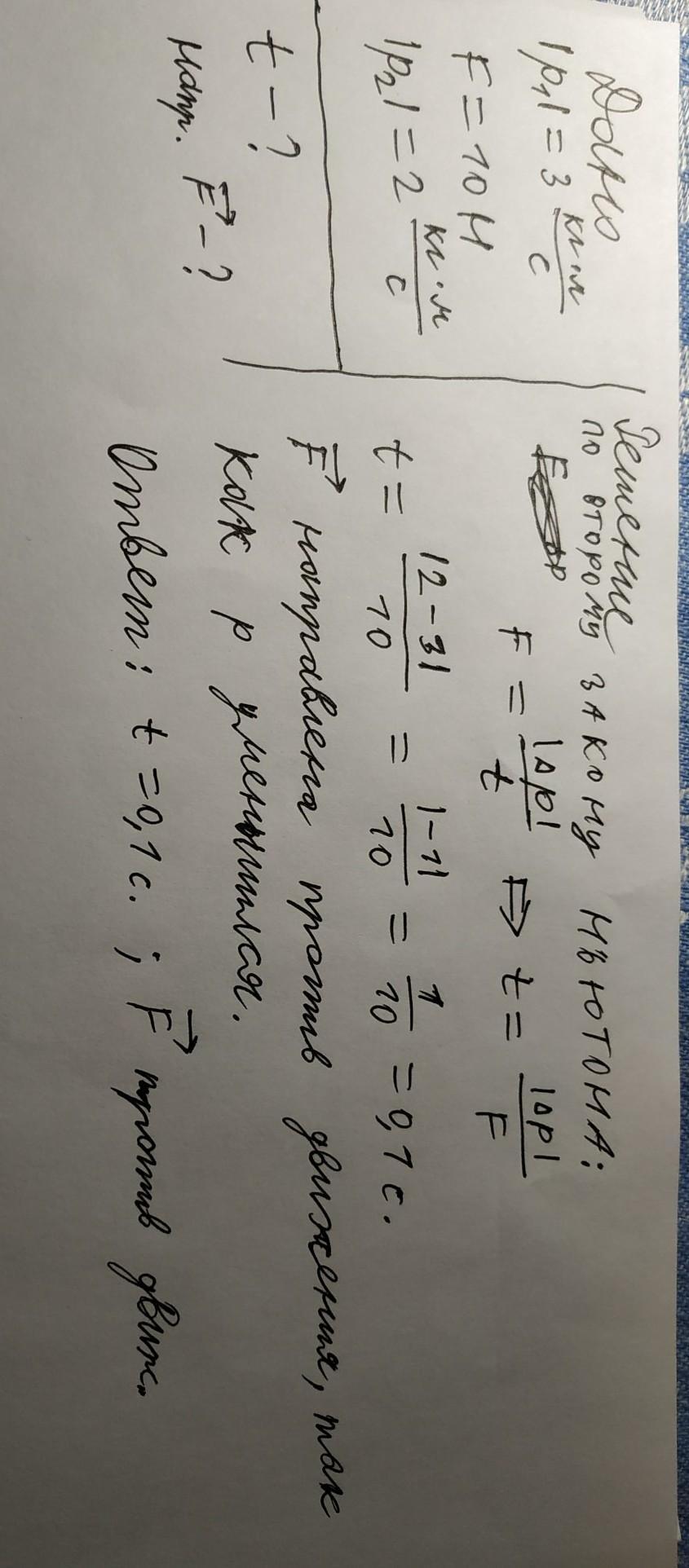 На тело, имевшее импульс с модулем p1 = 3 кг⋅м/c, направленный так, как показано на рисунке, в течение некоторого времени действовала сила F = 10 Н. В результате модуль импульса тела стал равным p2 = 2 кг⋅м/c (см. рис.). Куда направлена сила F→ и сколько времени она действовала?