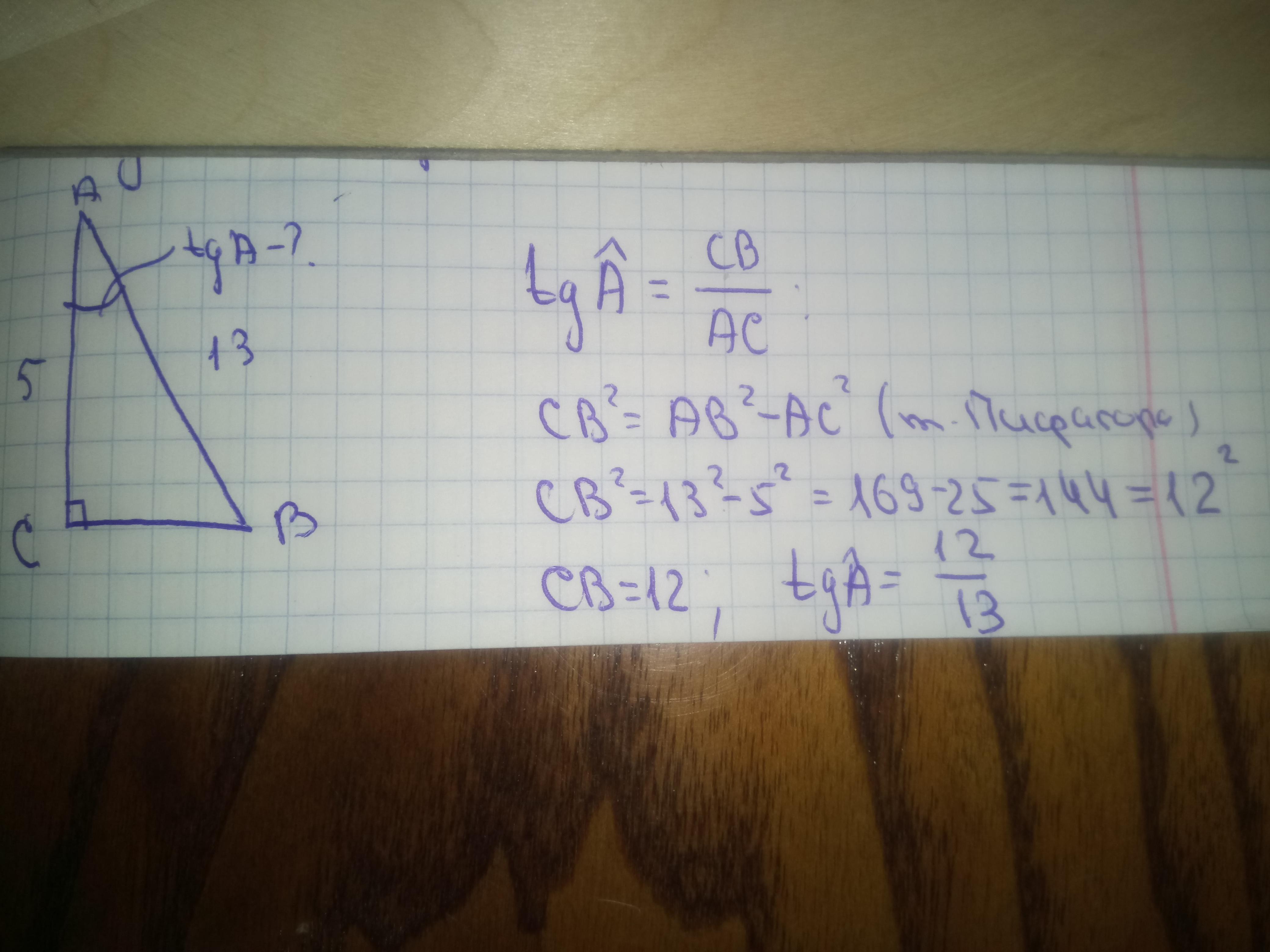 в треугольнике ABC угол C равен 90 градусов,AB=13,AC=5. найдите tgA​