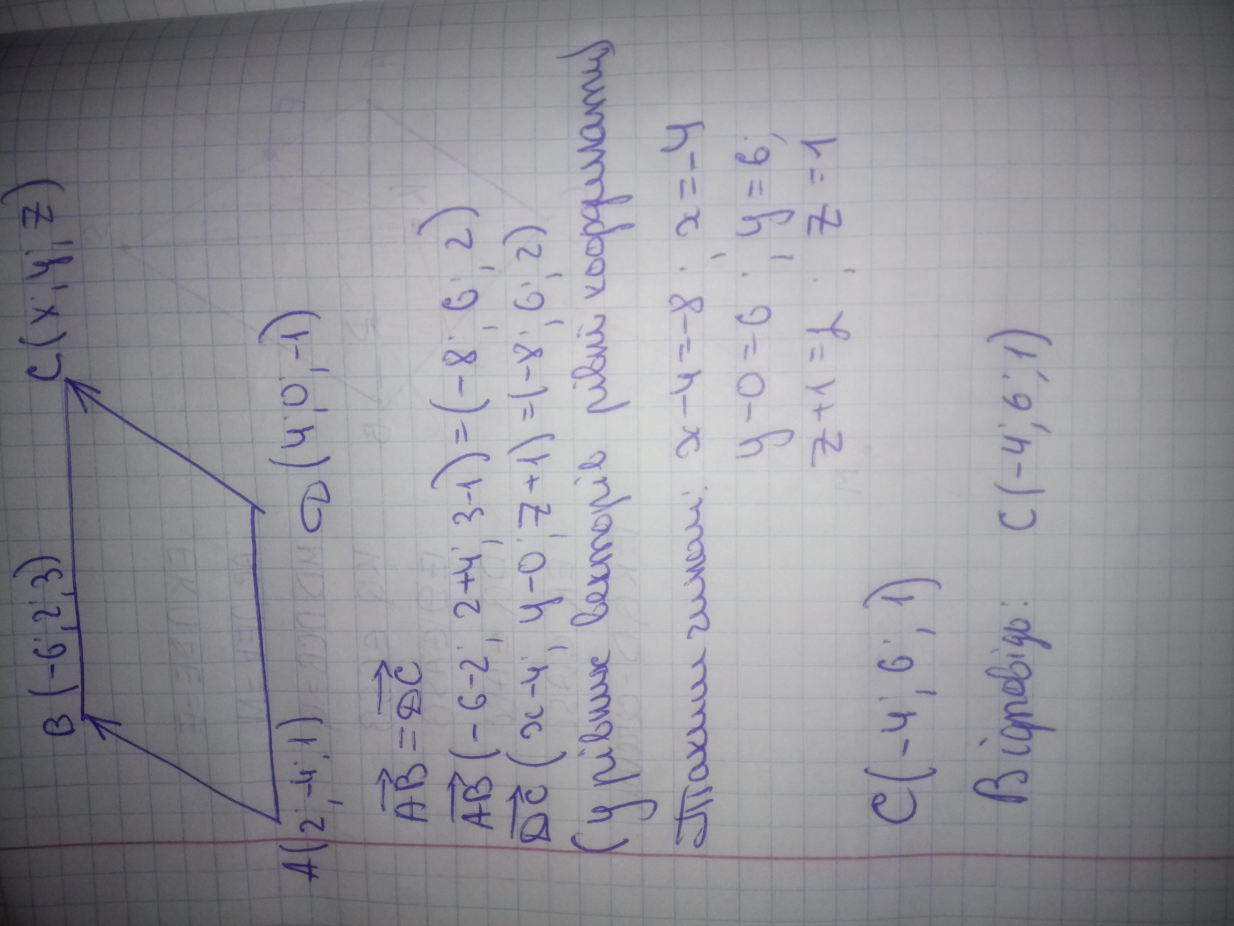 Точки А(2;-4;1), В(-6;2;3) і D(4;0;-1). Вершини паралелограма ABCD. Знайти координати вершини с паралелограма