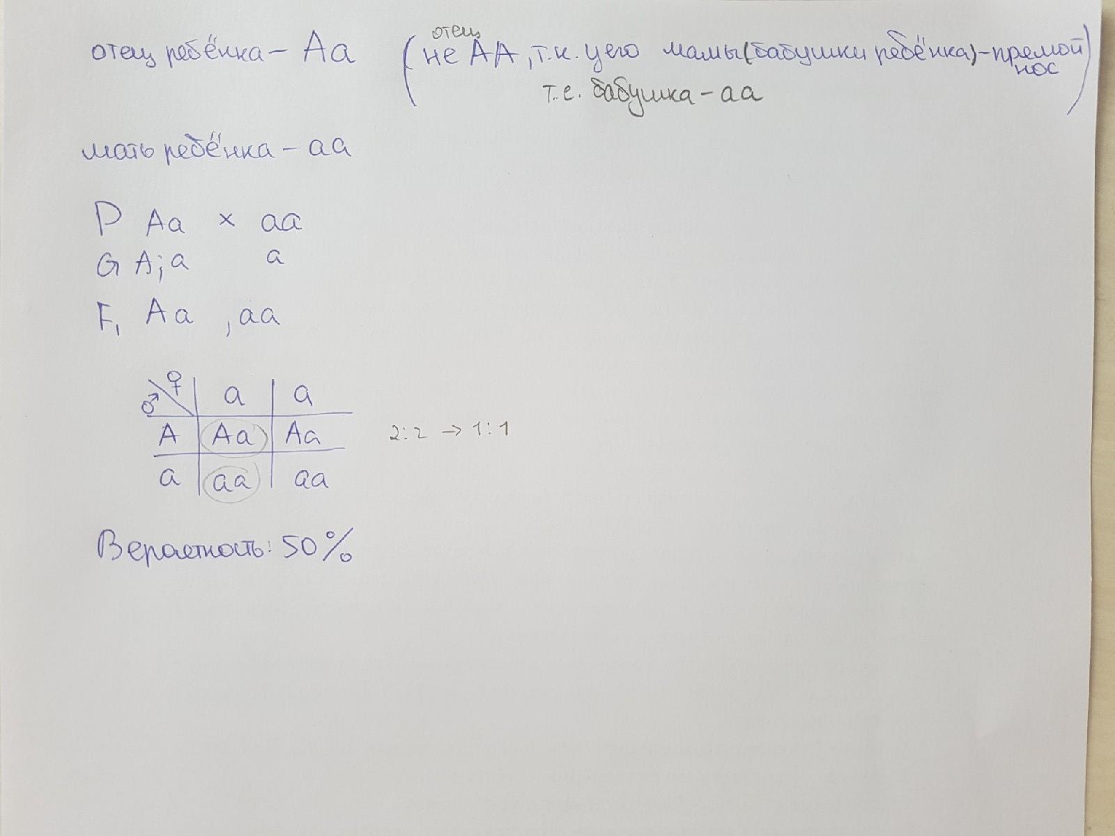 У людей горбатый нос доминирует над прямым .какова вероятность рождения ребенка с прямым носом, если известно, что у отца нос с горбинкой, у матери прямой, так же как и у матери отца?