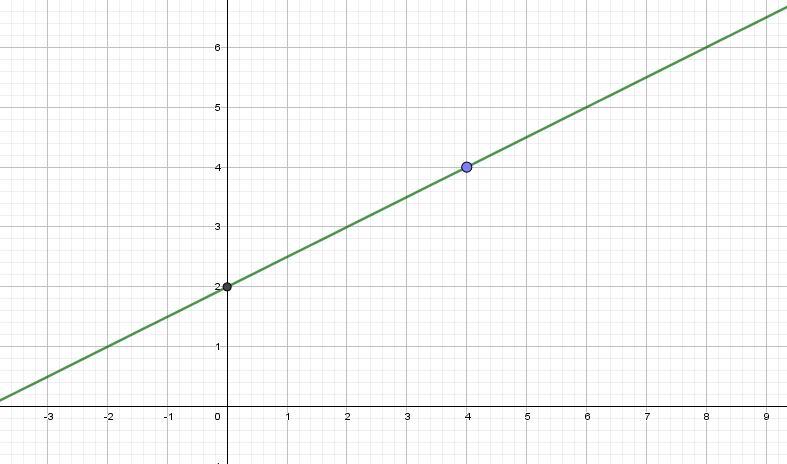 Воспользуемся тем, что график функции y = kx + b проходит через точки (4;4), (0;2), подставим их координаты в уравнение, получим систему уравнений: