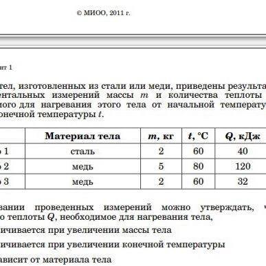 Для трех тел, изготовленных из стали или меди, приведены результаты