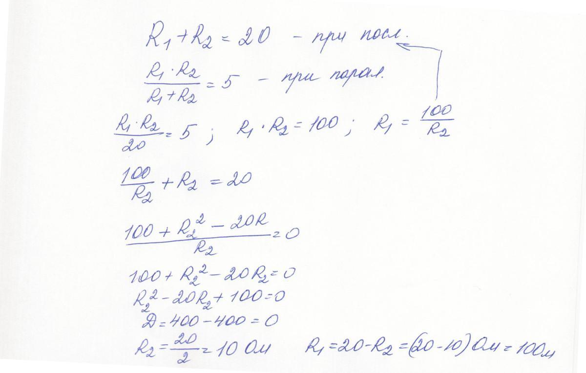 Каково сопротивление каждого из одинаковых проводников,если при их последовательном соединении получается сопротивление 20 Ом,а при параллельном 5 Ом