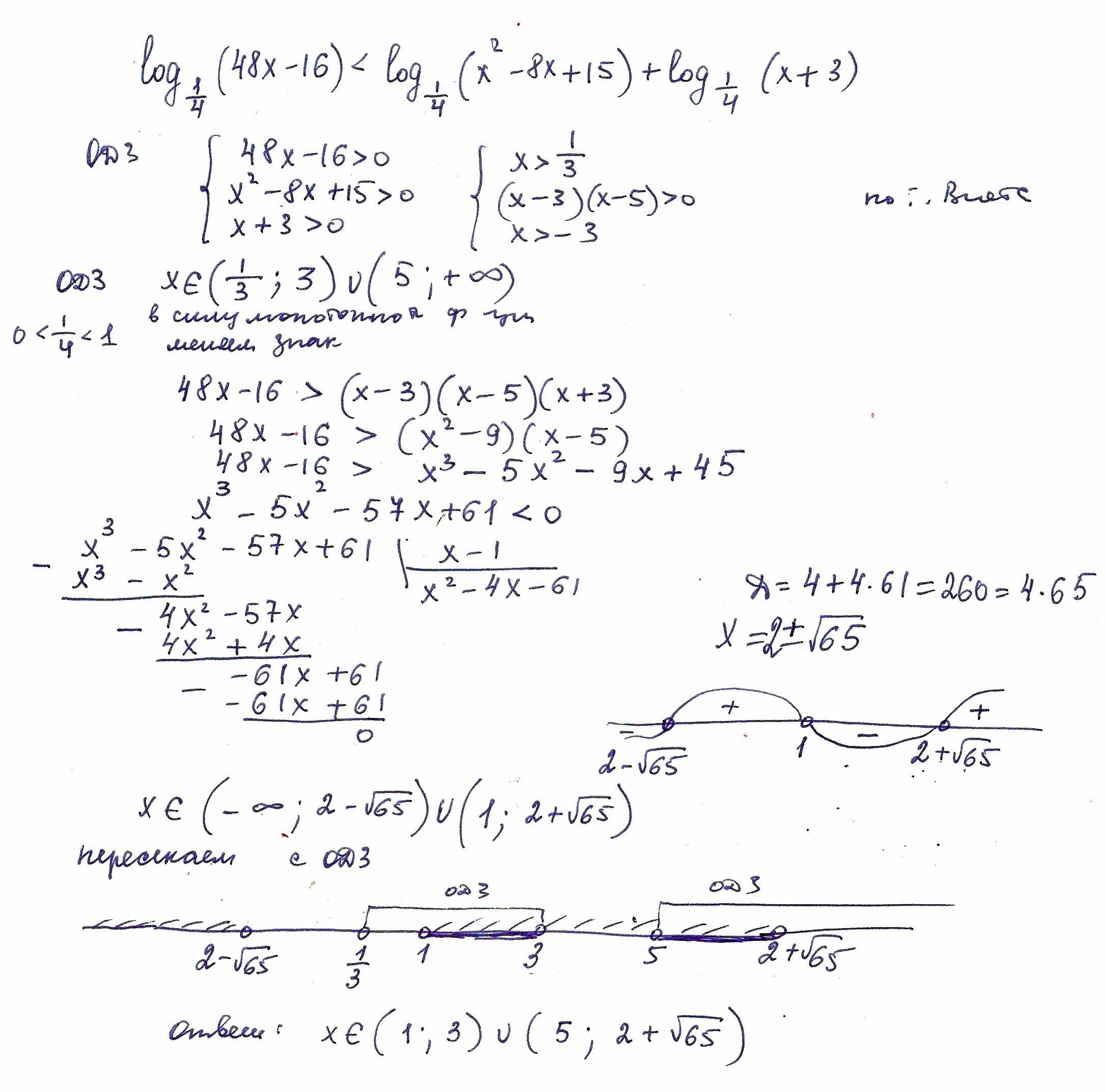 log1/4 (48x - 16) < log1/4 (x^2 - 8x + 15) + log1/4 (x + 3)