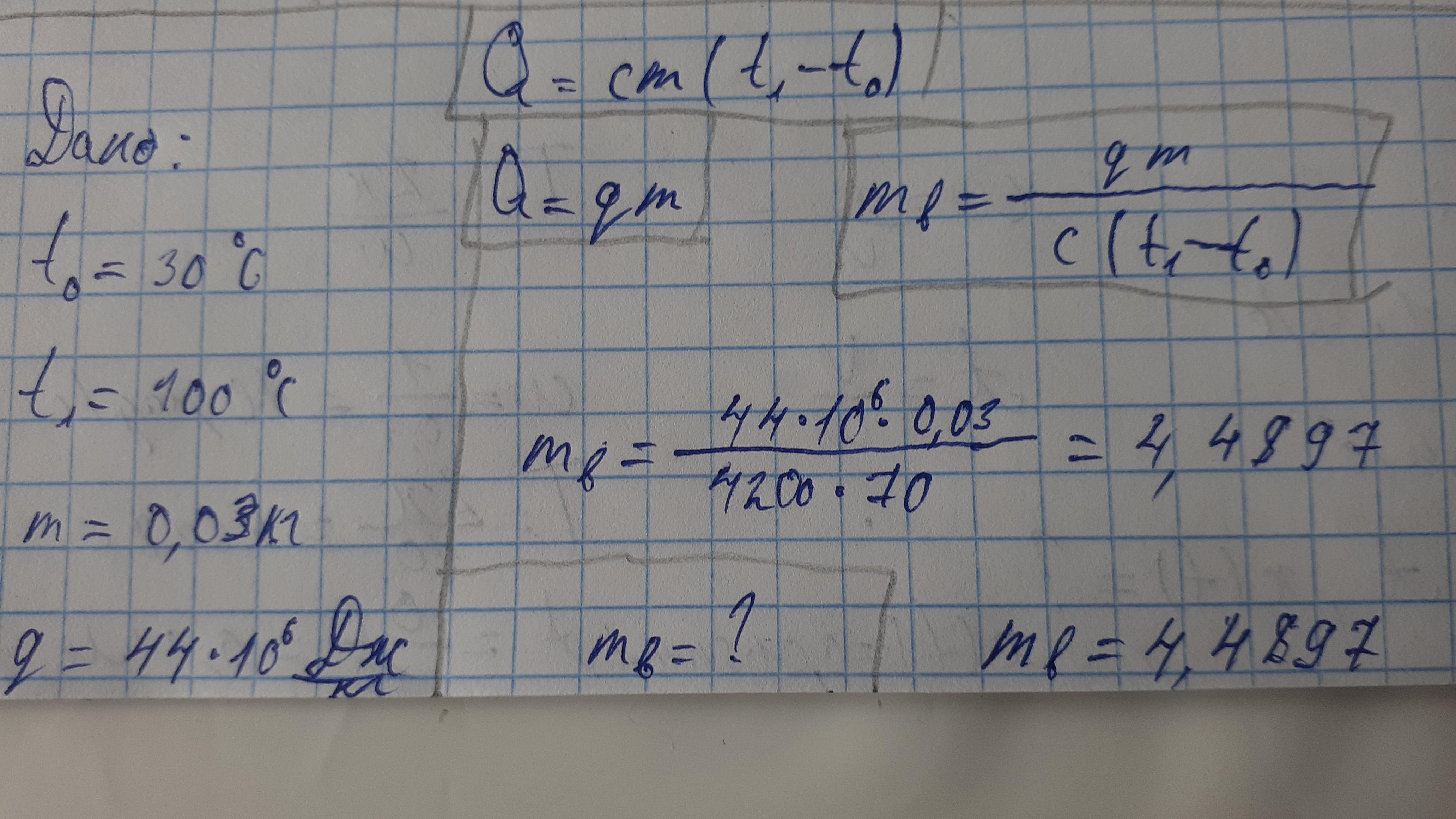 Воду нагрели от 30°С до 100°С и при этом сгоредо 30 г природного газа. Определите массу нагретой воды, если удеььная теплота сгорания топлива q= 44*10^6 Дж/кг и удельная теплоёмкость воды 2400°С. Вся энергия газа пошла на нагревание воды.