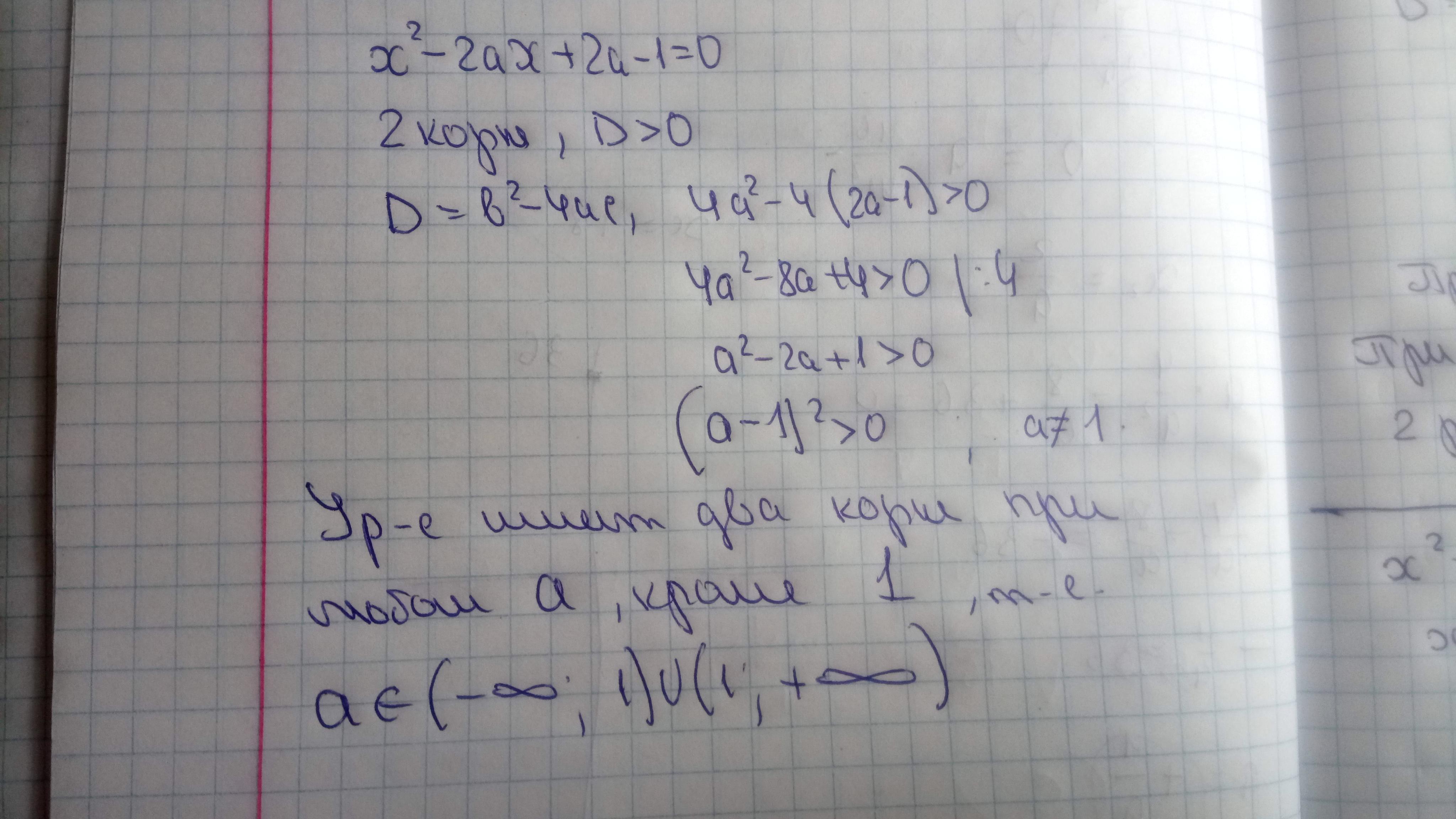 найдите все значения а при каждом из которых уравнение х^2-2ах+2а-1=0 имеет ровно два различных корня