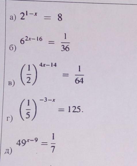 д) 49ˣ ⁻ ⁹=1/7; 7²ˣ ⁻ ¹⁸=7⁻¹; 2х-18=-1; х=17/2; х=8.5