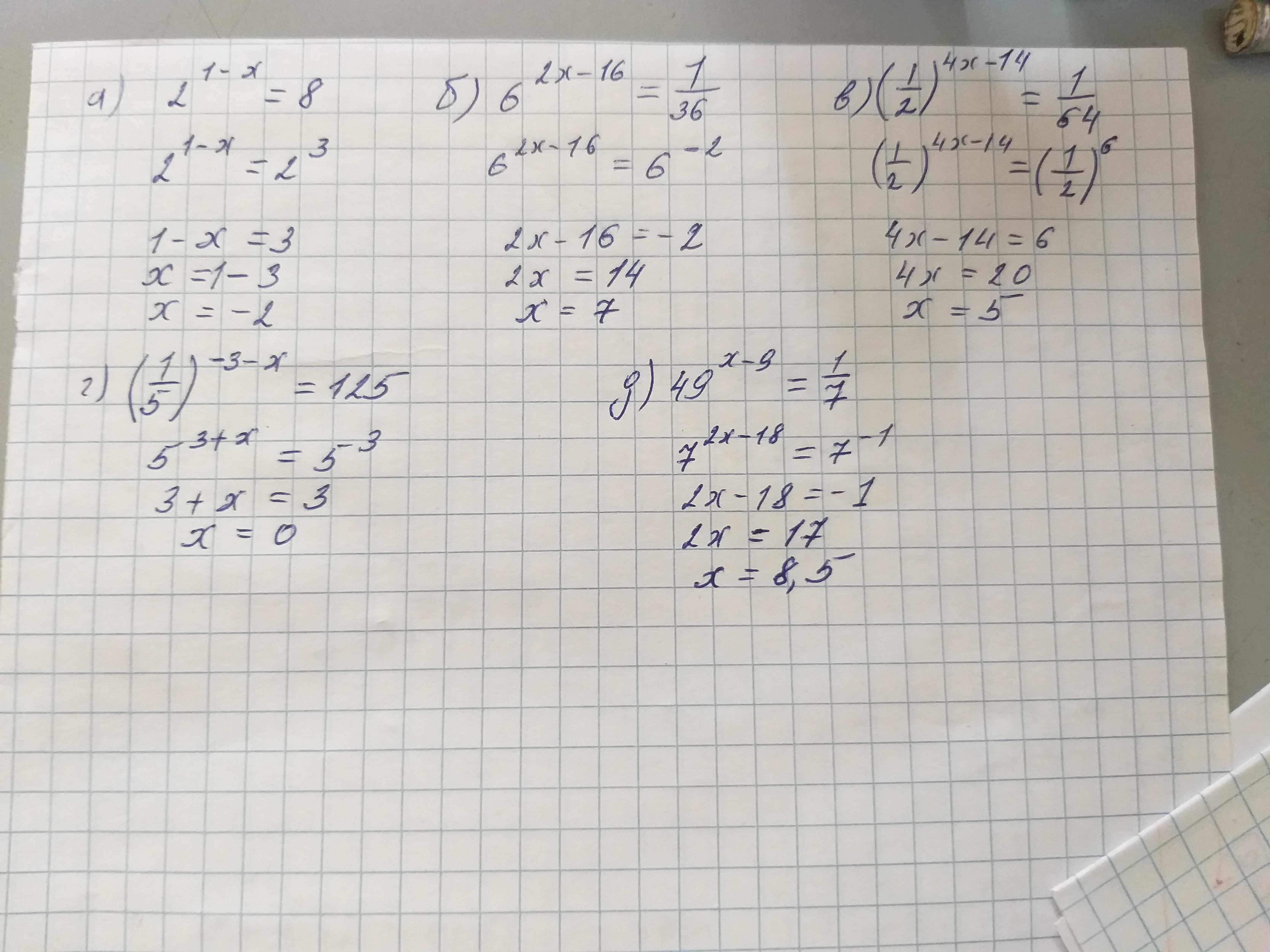 в) (1/2)⁴ˣ⁻¹⁴=1/64; (1/2)⁴ˣ⁻¹⁴=(1/2)⁶; 4х-14=6; х=20/4; х=5