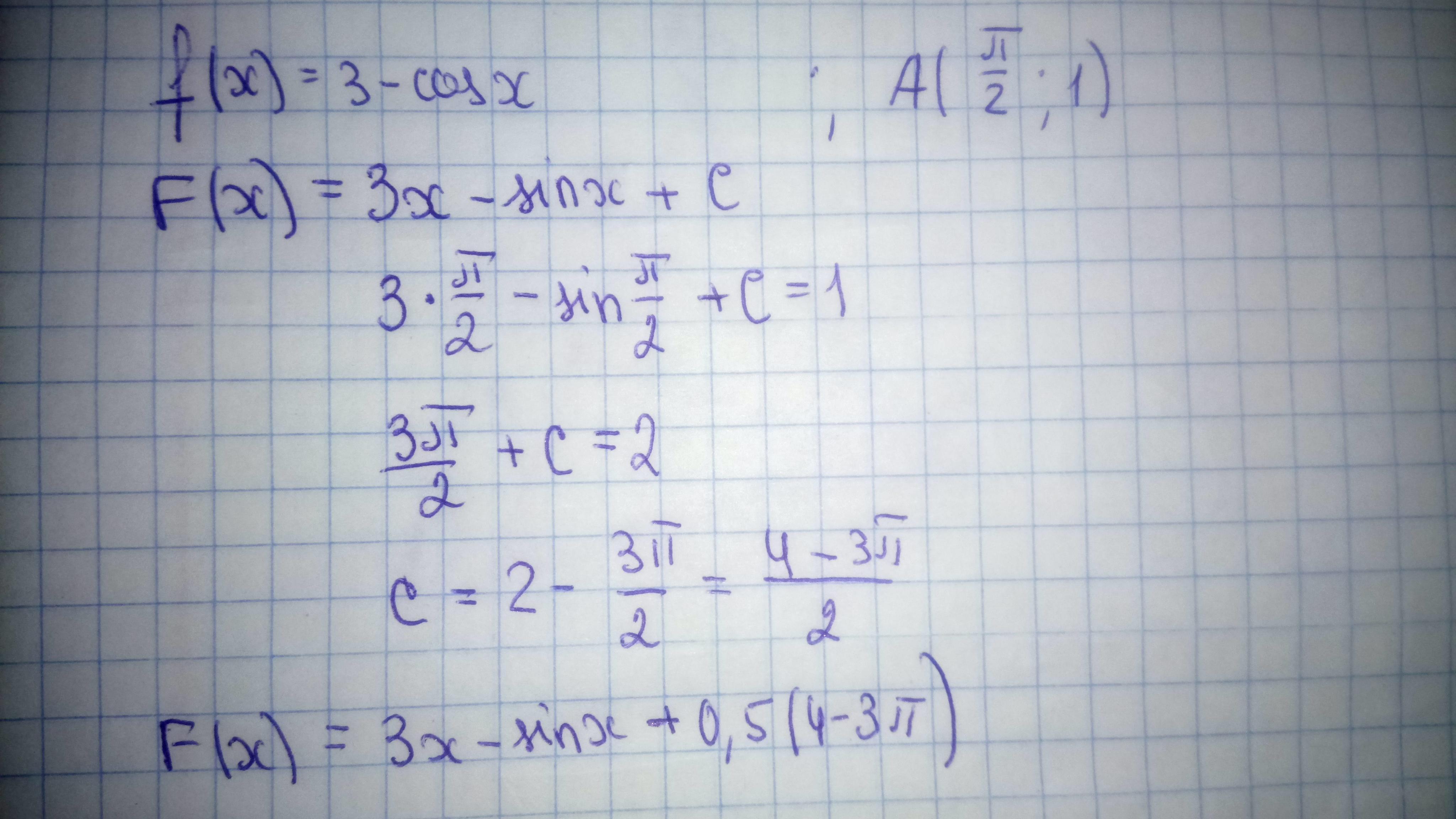 Для функции f(x)=3-cosx найдите первообразную, график которой проходит через точку A(π/2; 1)