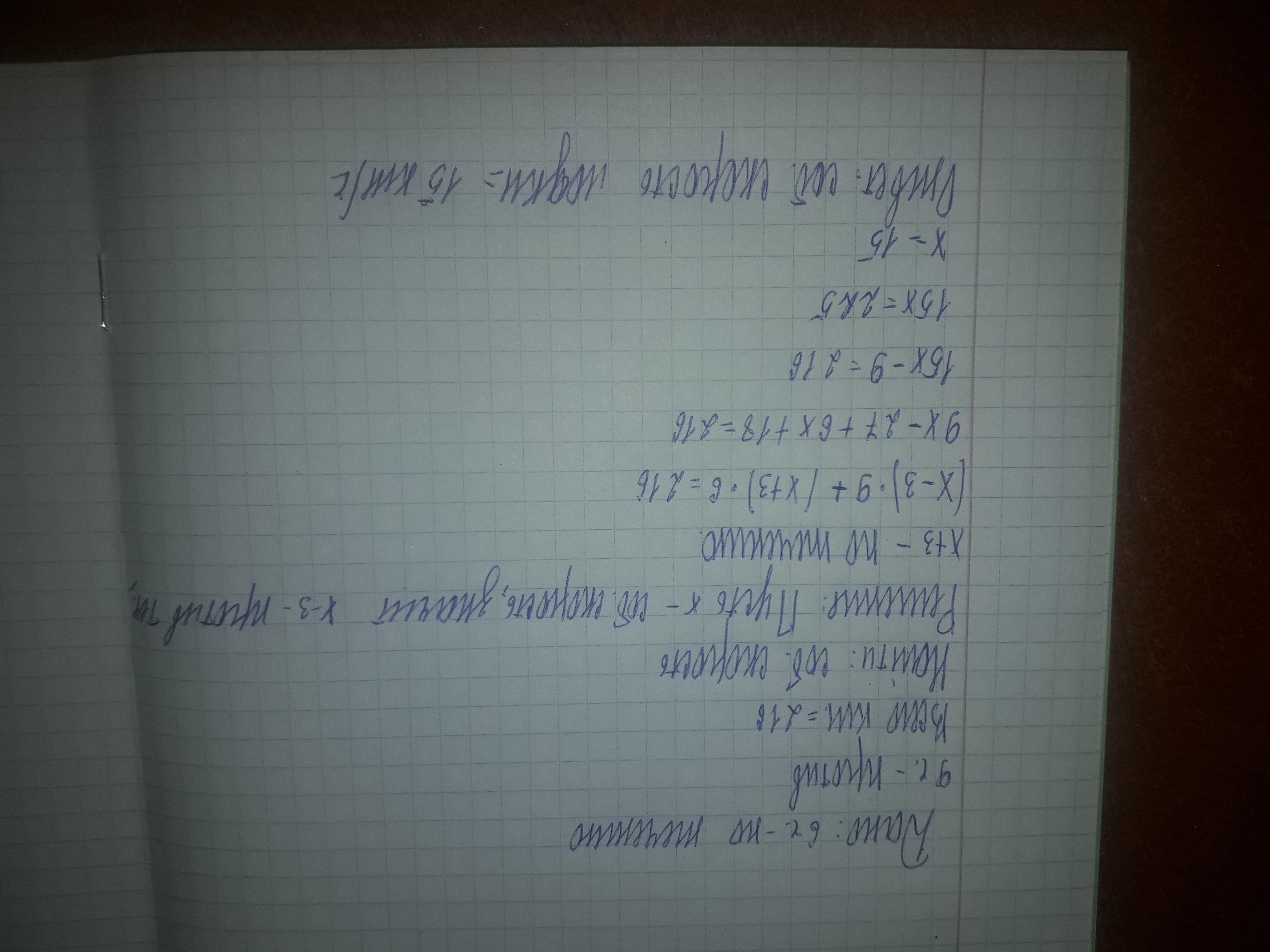 Моторная лодка ее имея режим работы двигателя, проплыла 6 ч по течению реки и 9 часов против течения реки. Всего лодка проплыла 216 км. Найти собственную скорость лодки , если скорость течения реки 3 км/ч