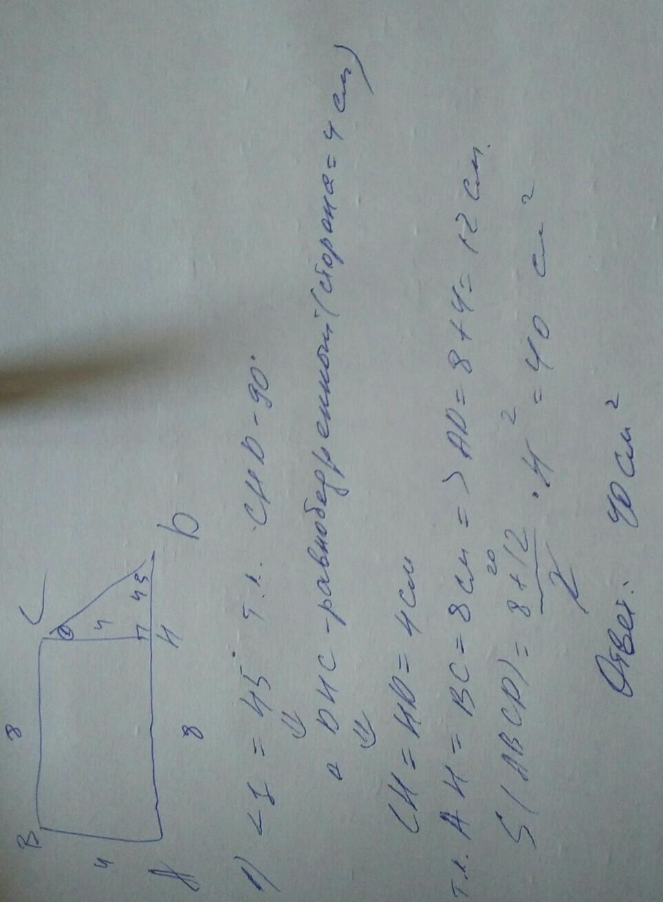найдите площадь прямоугольной трапеции если меньшая основания 8 см , а высота 4см а острый угол 45