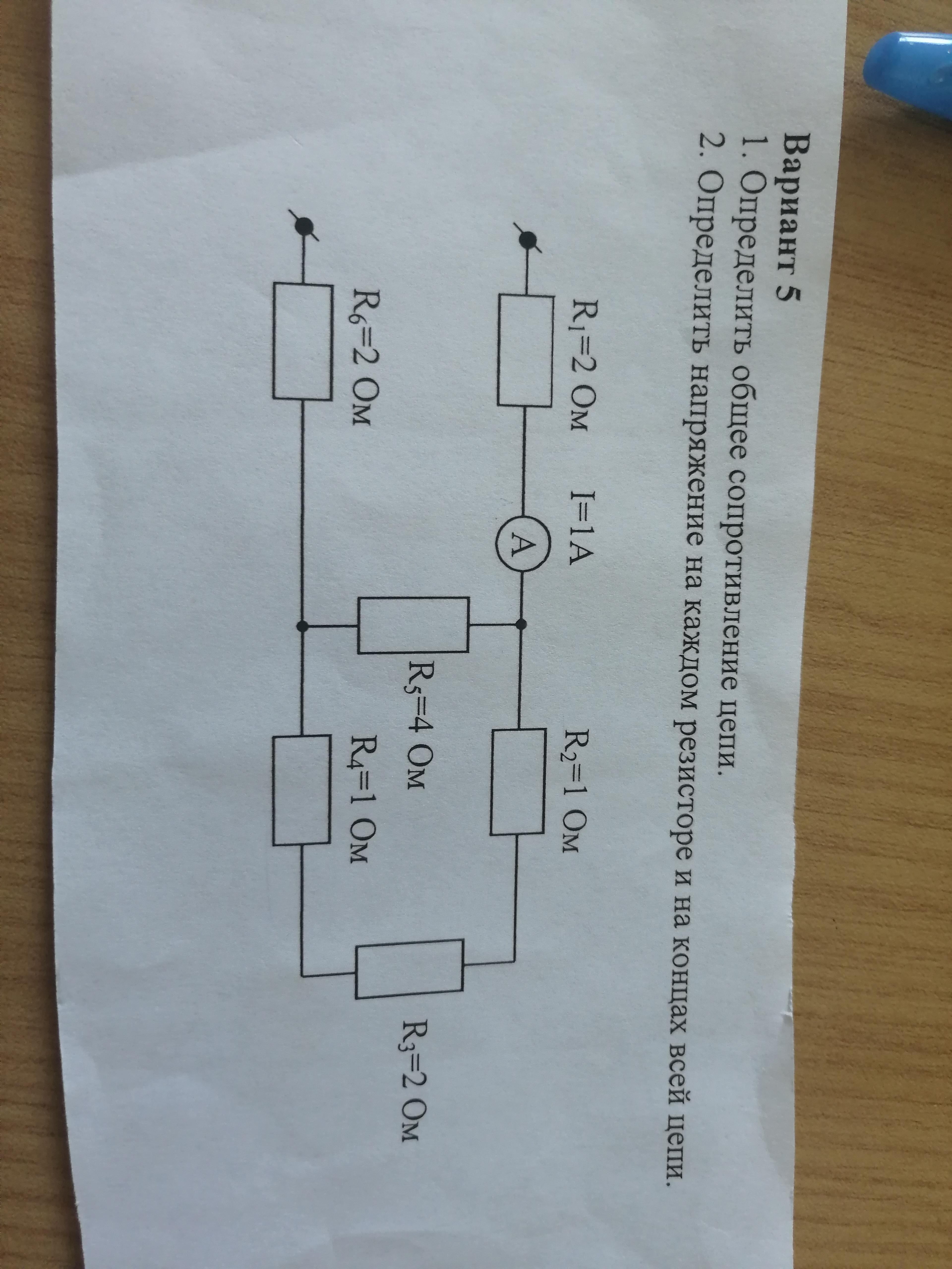 Uобщ=I*Rобщ=1*6=6В, U1=I*R1=2B, U2=2B, U5=U234= 2B, I234=U234/R234=2/4=0.5A, U2=0.5B, U3=1B, U4=0.5B