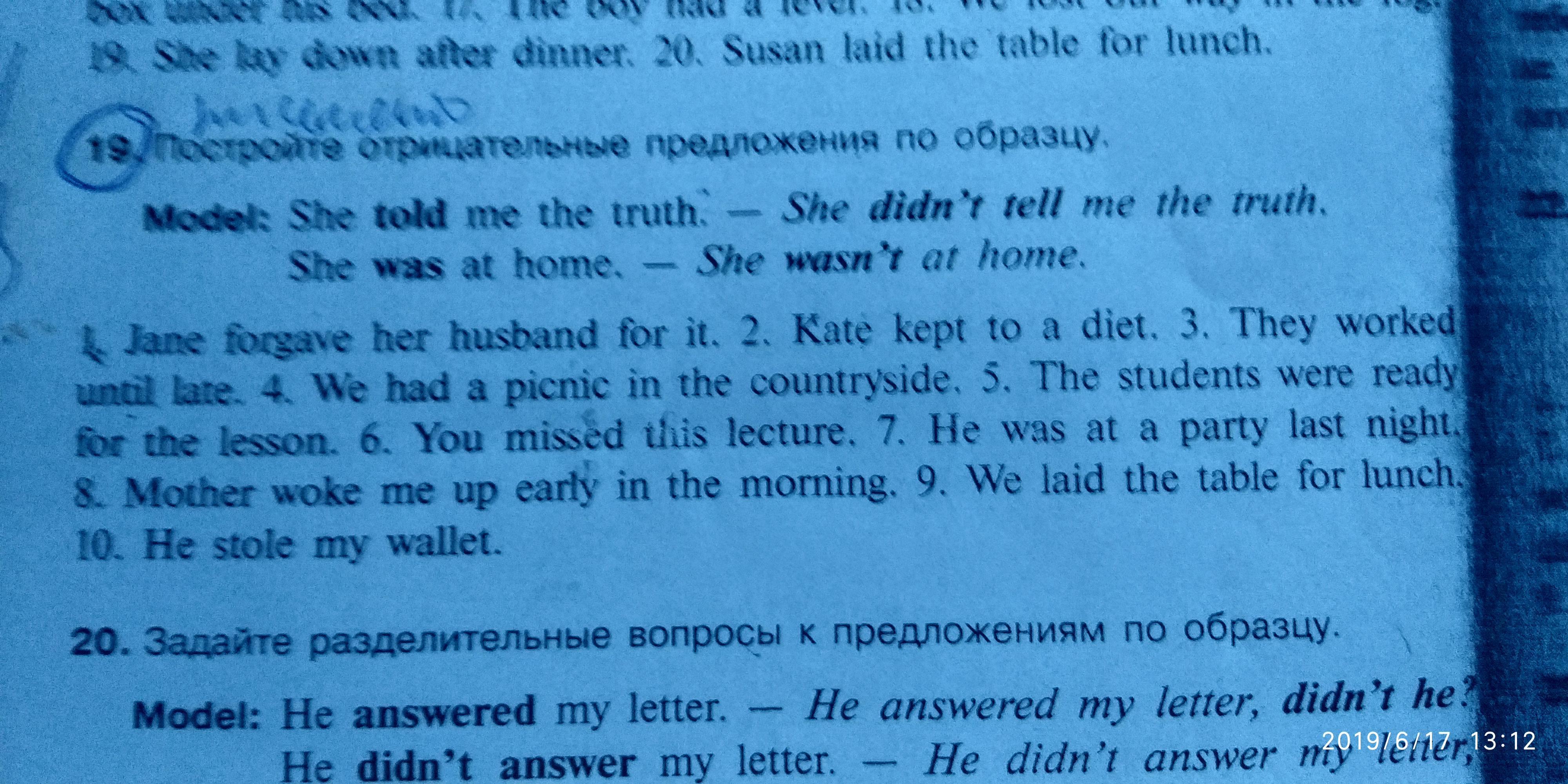 1.Jane didn't forgive her husband for it. 2.Kate didn't keep to a diet. 3.They didn't work until late. 4.We didn't have a picnic in the countryside. 5.The students weren't ready for the lesson. 6.You did not miss this lecture. 7.He wasn't at a party last night. 8.Mother didn't wake me up early in the morning. 9.We don't laid the table for lunch. 10. He didn't steal my wallet.