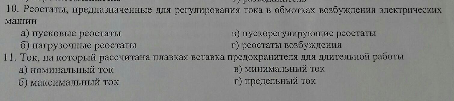 И так. В 10 вопросе ответ Г, т.к. реостаты возбуждения применяются для регулирования тока в обмотках возбуждения электрических машин постоянного и переменного тока.