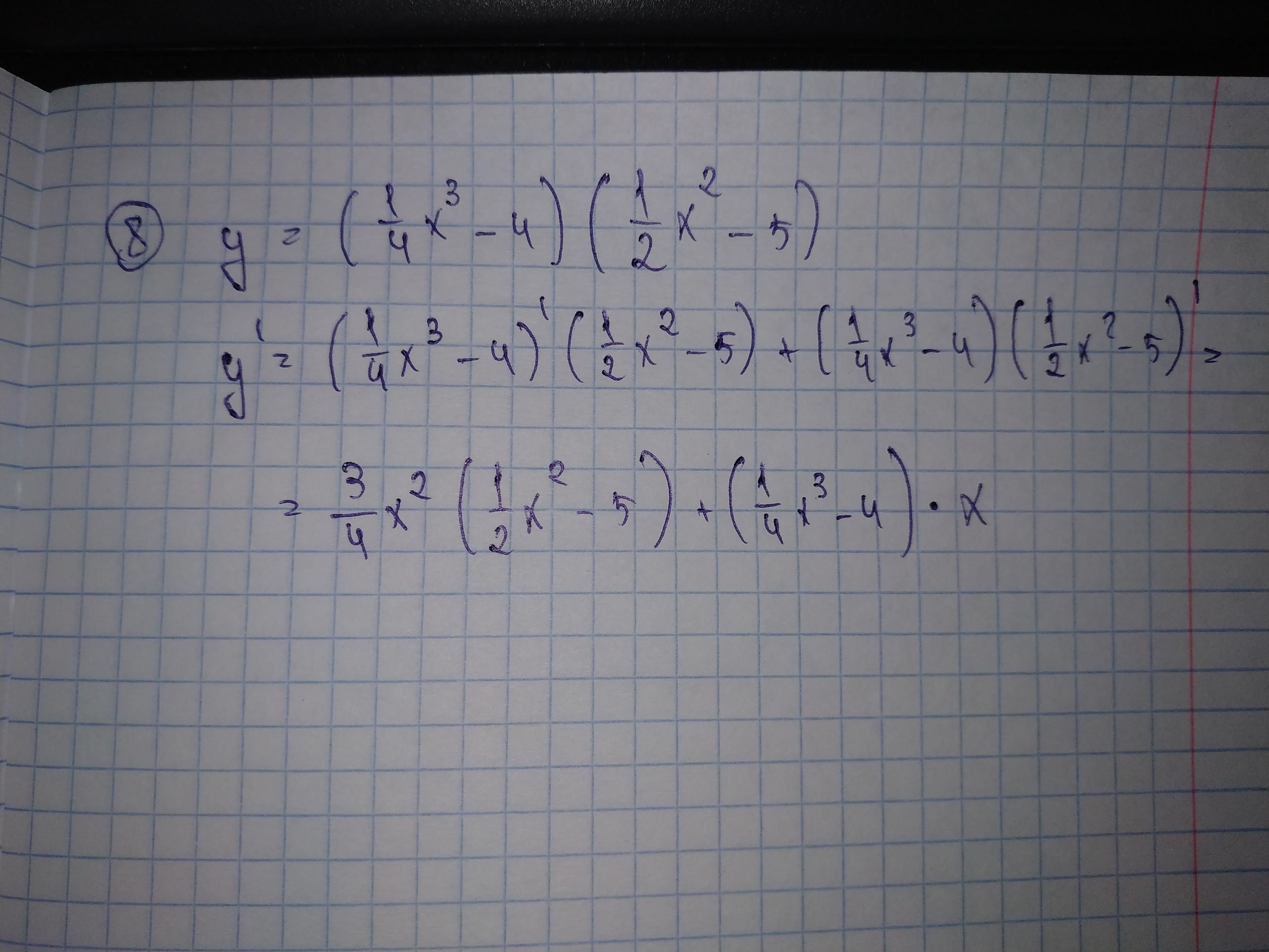 y'=(1/4x^3-4)'*(1/2x^2-5)+(1/4x^3-4)*(1/2x^2-5)'=3/4x^2*(1/2x^2-5)+(1/4x^3-4)*x=3/8x^4-15/4x^2+1/4x^4-4x=5/8x^4-15/4x^2-4x
