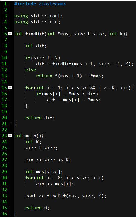 Вася решил заняться торговлей рыбой. С помощью методов машинного обучения он предсказал цены на рыбу на N дней вперёд. Он решил, что в один день он купит рыбу, а в один из следующих дней — продаст (то есть совершит или ровно одну покупку и продажу или вообще не совершит покупок и продаж, если это не принесёт ему прибыли). К сожалению, рыба — товар скоропортящийся и разница между номером дня продажи и номером дня покупки не должна превышать K.