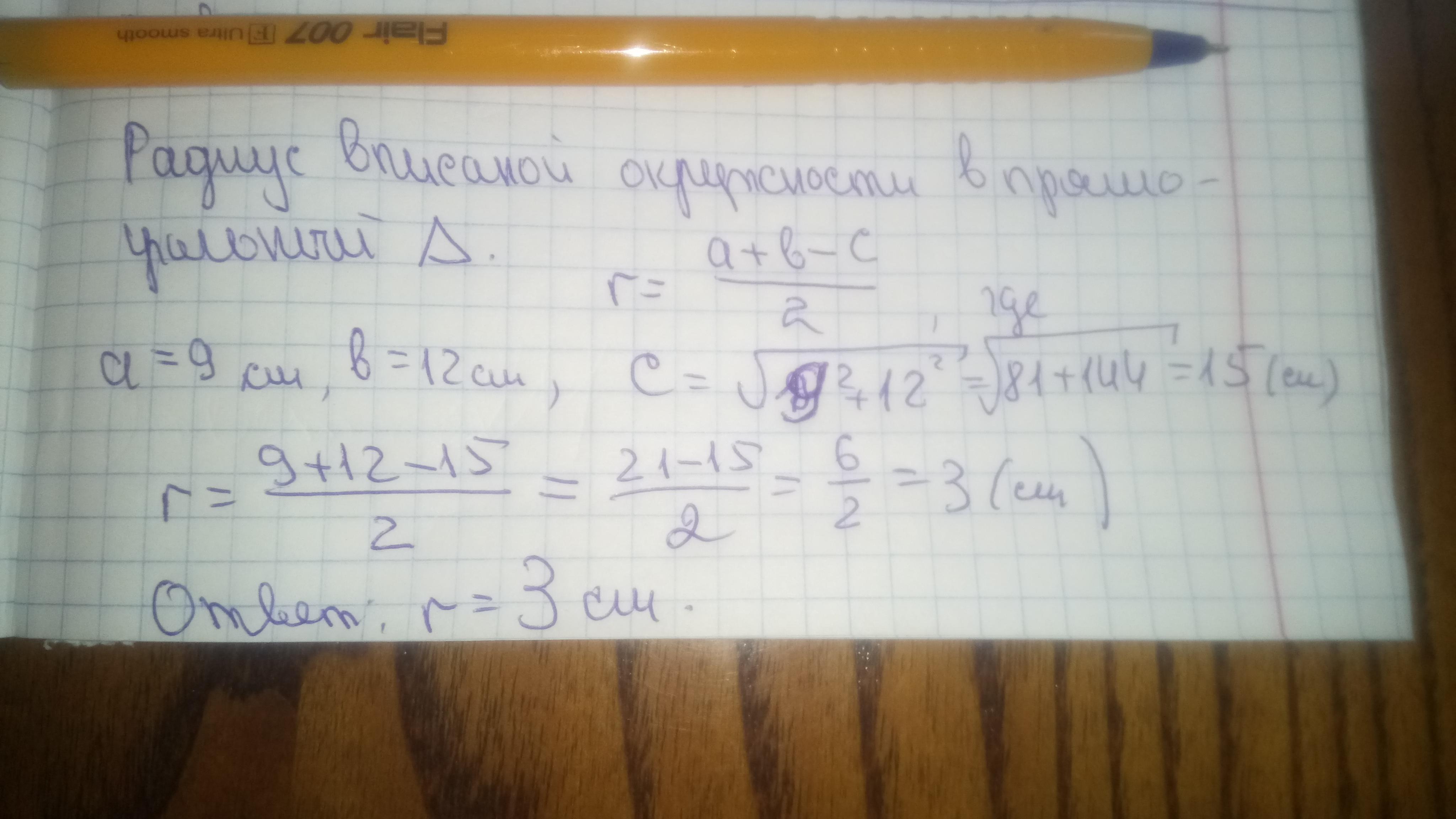 Найдите радиус вписаной окружности в прямоугольном триугольнике с катетами с длиной 9см и 12см.