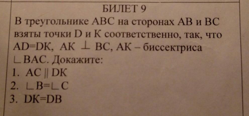 1) тр-к АДК-равноб-й, значит <DAK=<DKA, <DAK=<KAC( по усл),тогда <DKA=<KAC(они соответственные), значит AC || DK