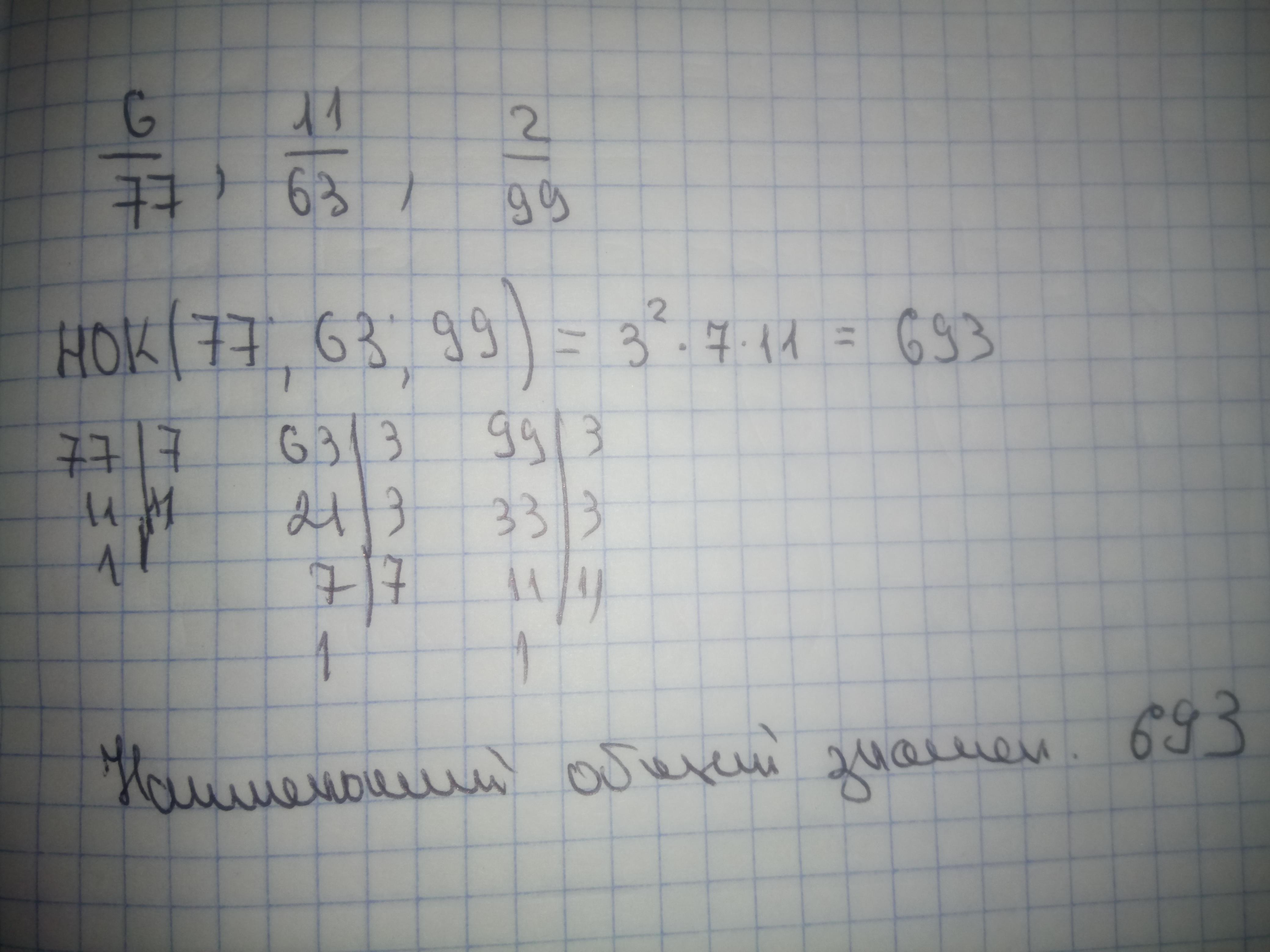 Смотрите, мы берём все множители с числа 63, это 3×3×7=3^2×7. Теперь смотрим на множители числа 77, это 7 (уже есть, не пишем) и 11. Получается 3×3×7×11. В числе 99 множители 11 и две 3. Уже присутствуют, не дописываем. 3 я записала в квадрате, их же две. Можете не писать квадрат, запишите 3×3×7×11=693