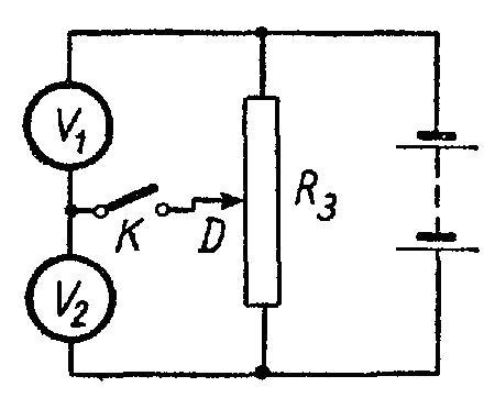 Два вольтметра с внутренними сопротивлениями 6000 Ом и 4000 Ом соединены последовательно. Параллельно к ним включено сопротивление 10000 Ом. На эту систему дано напряжение 180 В. Каковы показания вольтметров, когда ключ К замкнут, а движок D соединен с серединой сопротивления R3?