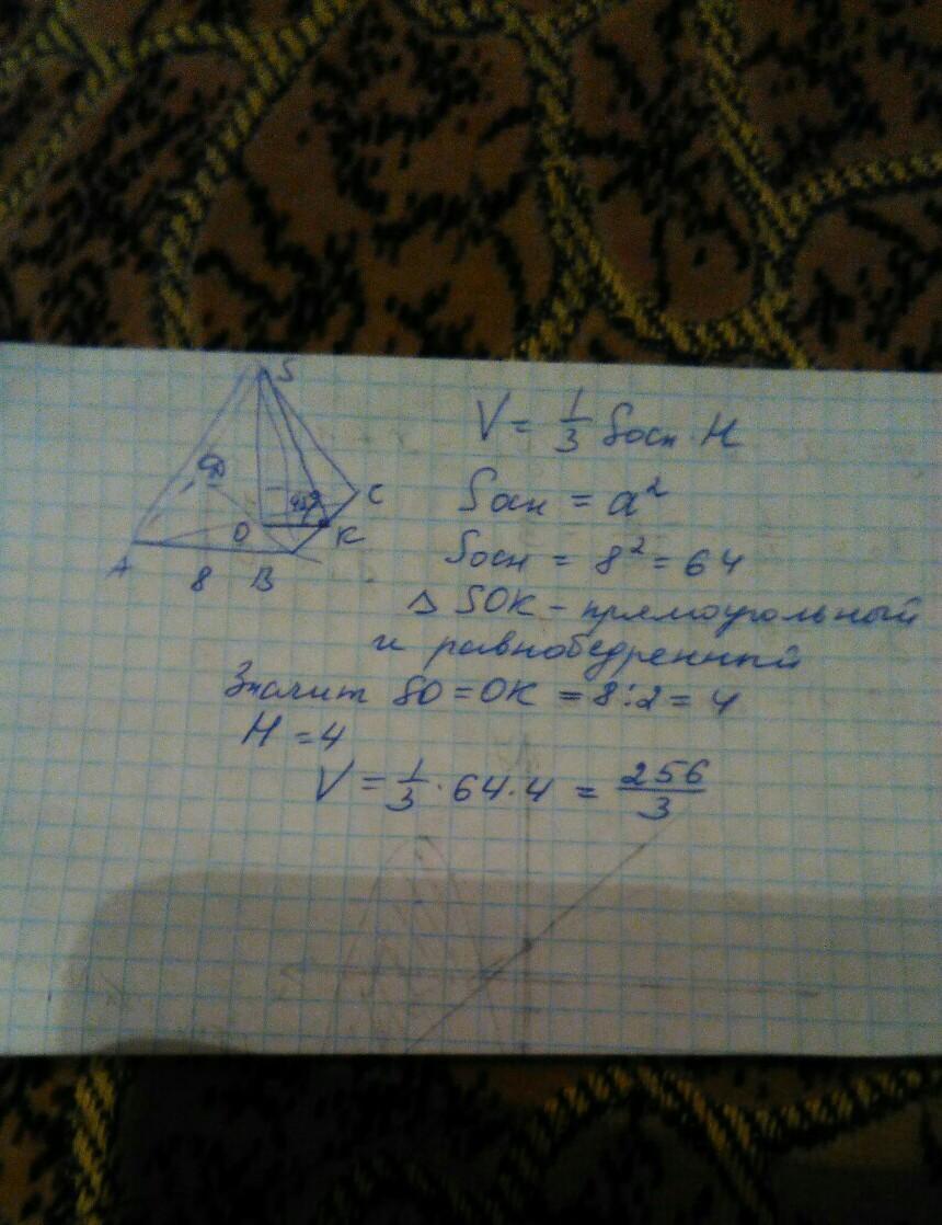 СРОЧНО. С РИСУНКОМ И ПОЯСНЕНИЯМИ. В правильной четырехугольной пирамиде сторона основания равна 8 дм. Боковая грань образует с плоскостью основания угол в 45 градусов. Вычислите обьем пирамиды