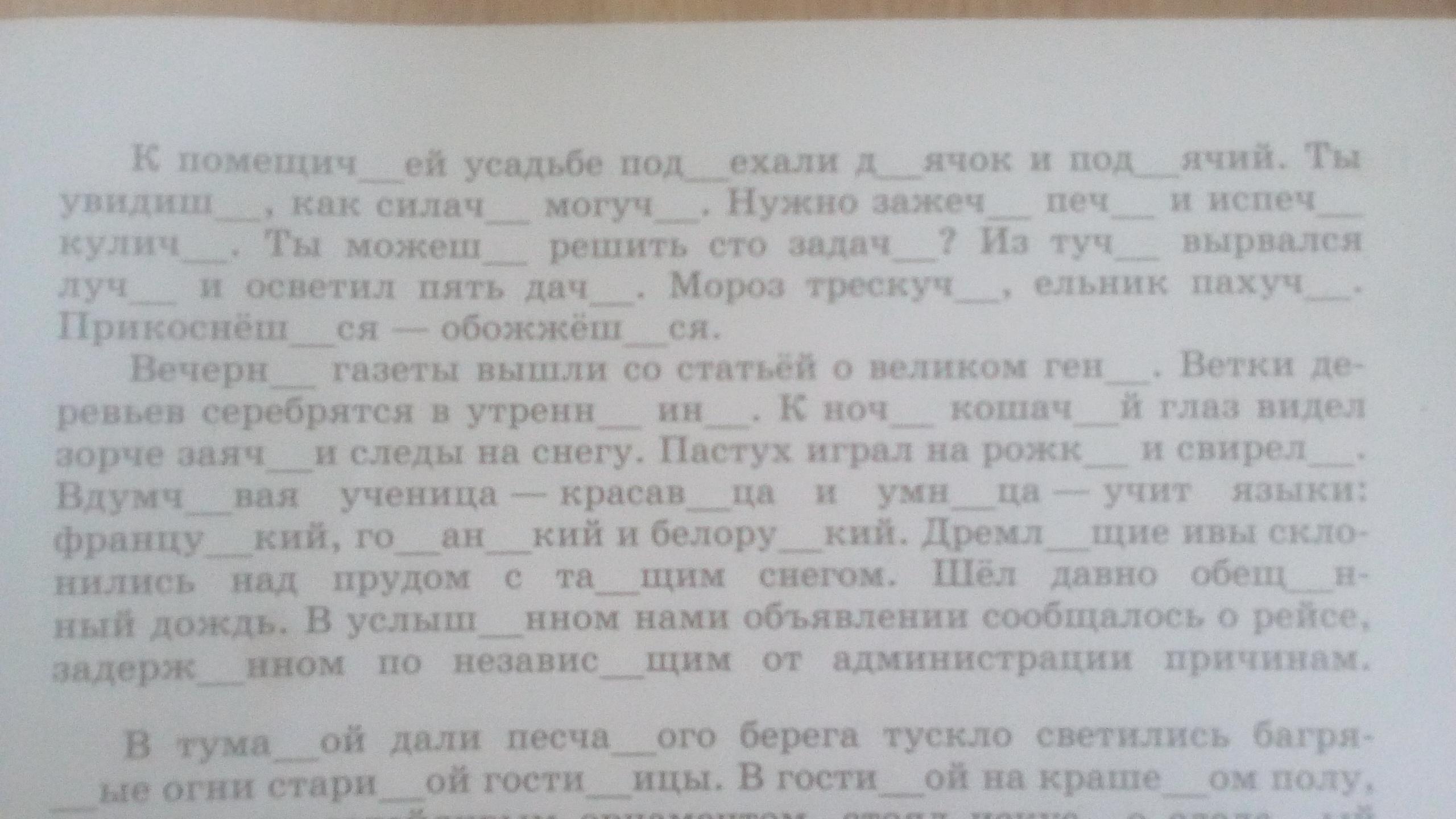 Вечерние газеты вышли со статьёй о великом гении. Ветки деревьев серебрятся в утреннем инее. К ночи кошачий глаз видел зорче заячьи следы на снегу. Пастух играл на рожке и свирели. Вдумчивая ученица — красавица и умница — учит языки: французский, гоанский и белорусский. Дремлющие ивы склонились над прудом с тающим снегом. Шёл давно обещанный дождь. В услышанном нами объявлении сообщалось о рейсе, задержанном по не зависящим от администрации причинам.