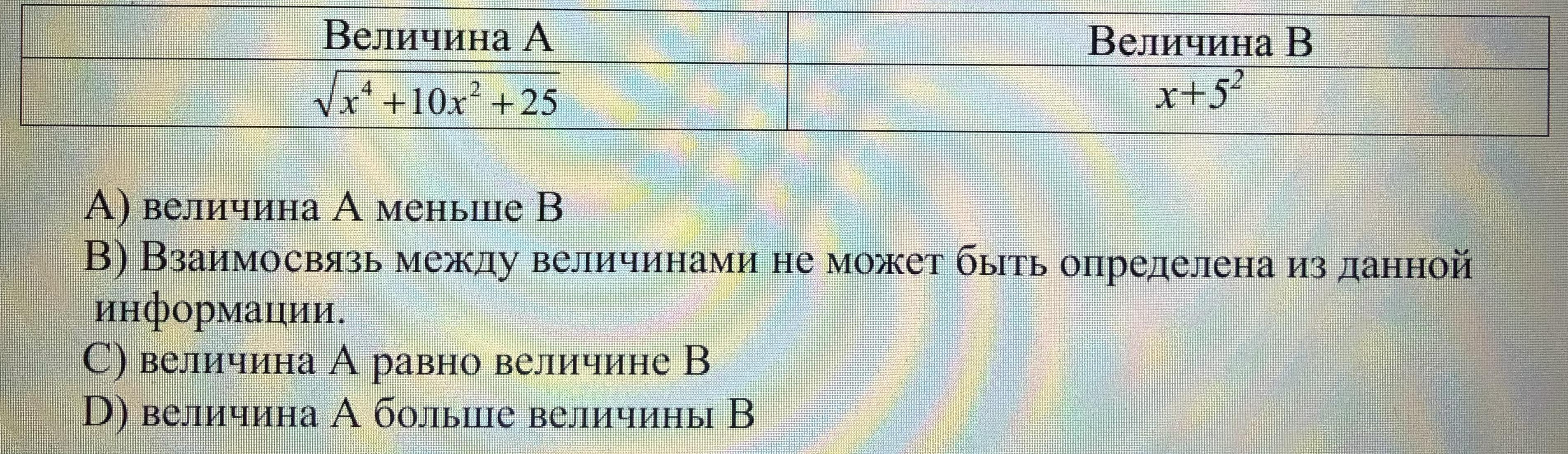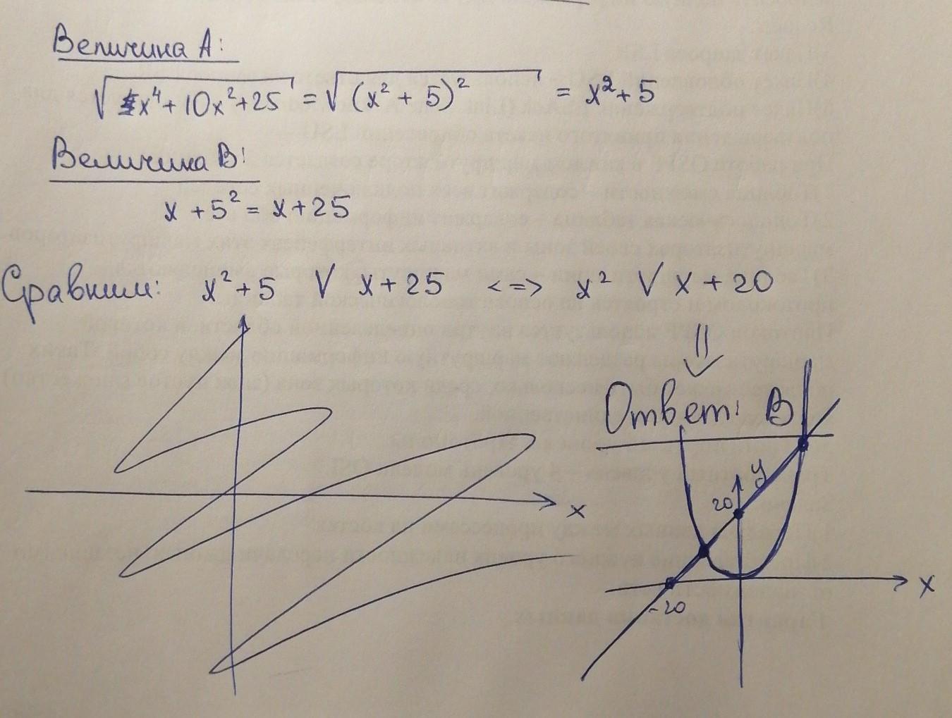 Ответ: ответ В). Например, при х=0 значение функции В равно 25, а значение функции А равно 5. Для х=5 имеем значение В равное 30, а для функции А имеем значение √(625+250+25)=30.