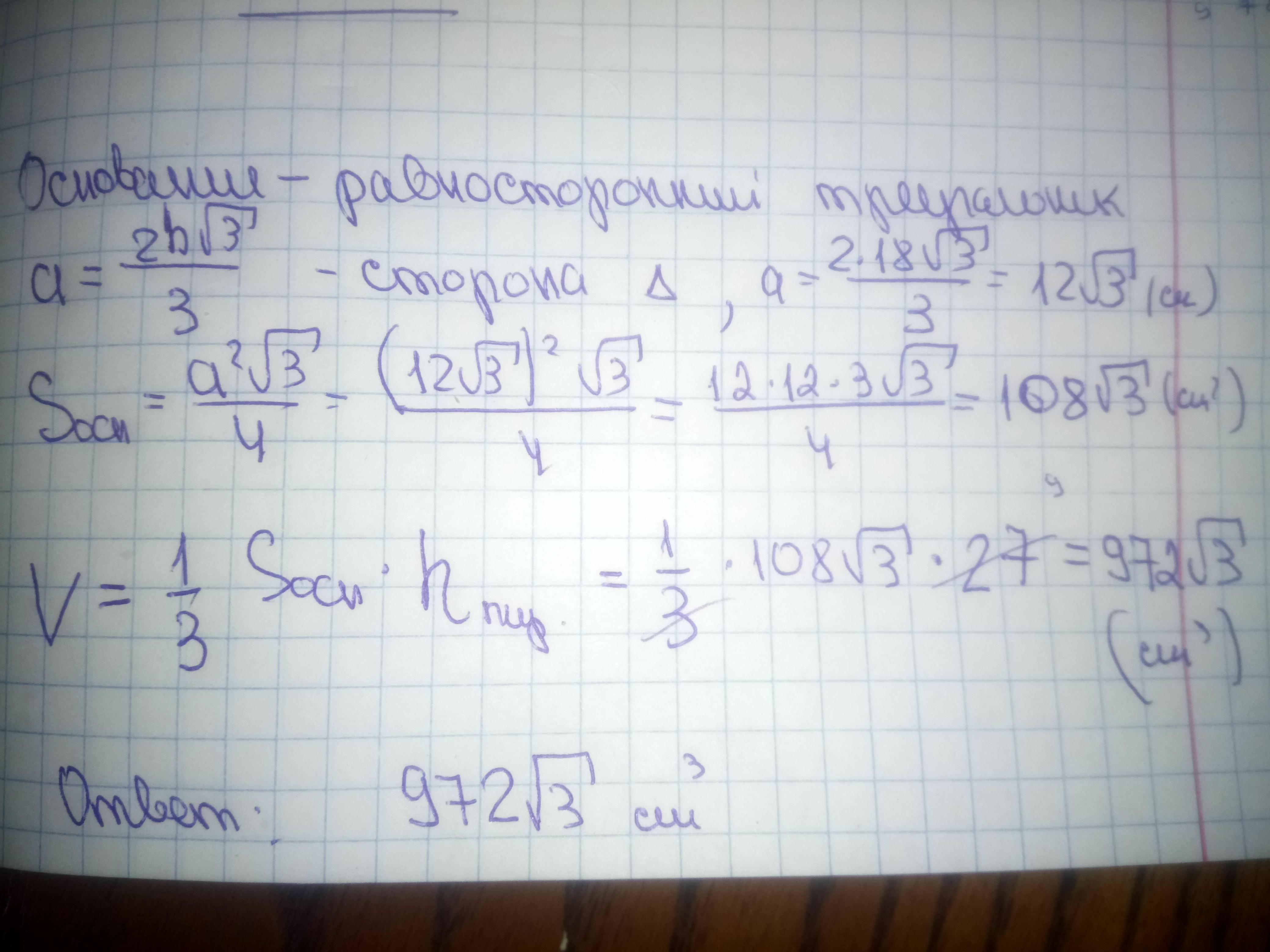 В правильной треугольной пирамиде высота равна 27 см, а высота основания 18 см. Найти объём пирамиды.
