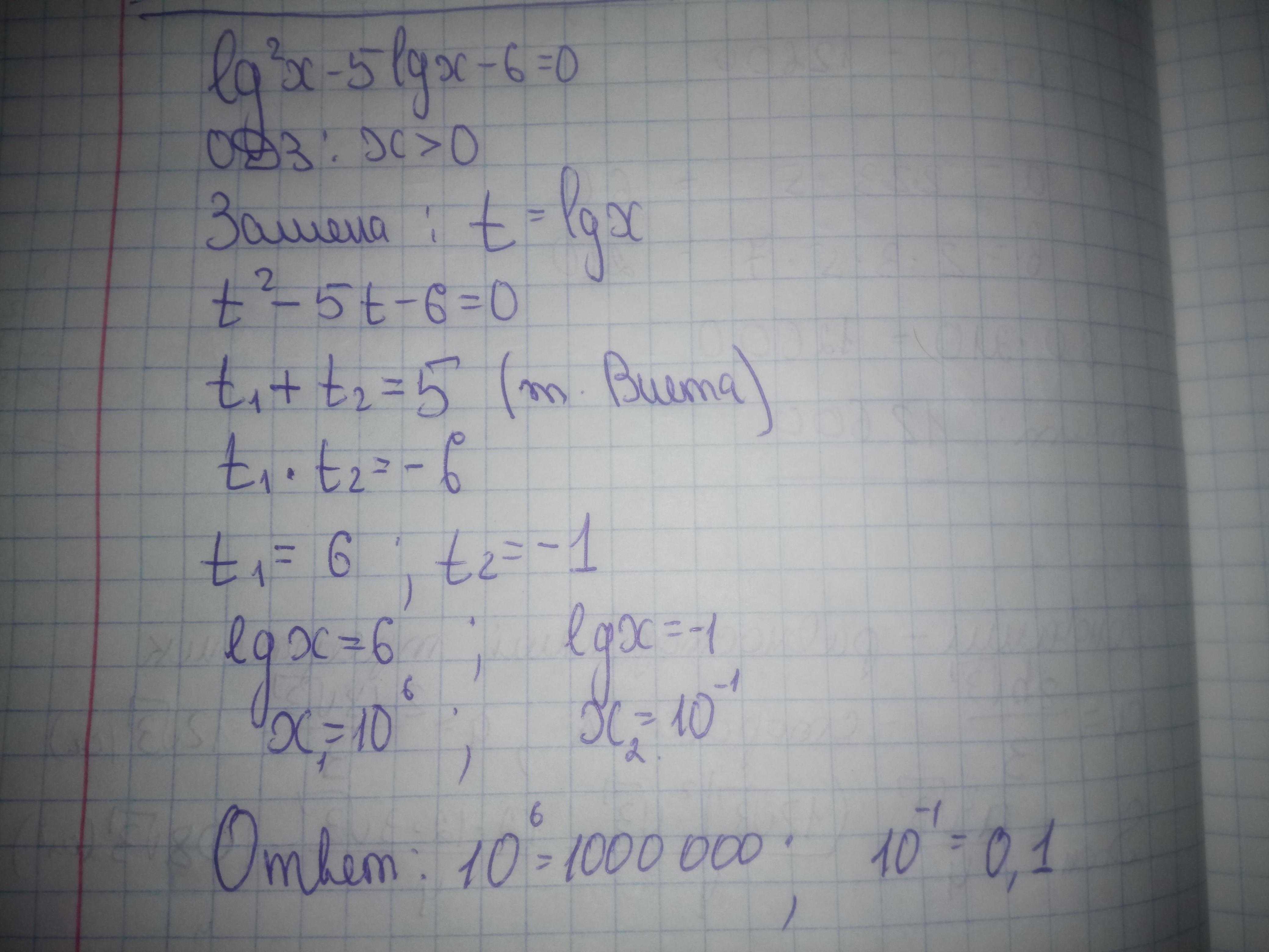 lg²x-5lgx-6=0; ОДЗ х- положительно, lgx=у, тогда у²-5у-6=0; по теореме, обратной теореме Виета, крпеи уравнения равны -1 и 6, lgх=-1, тогда х=0.1; lgх=6, х=1000000, оба корня входят в ОДЗ,