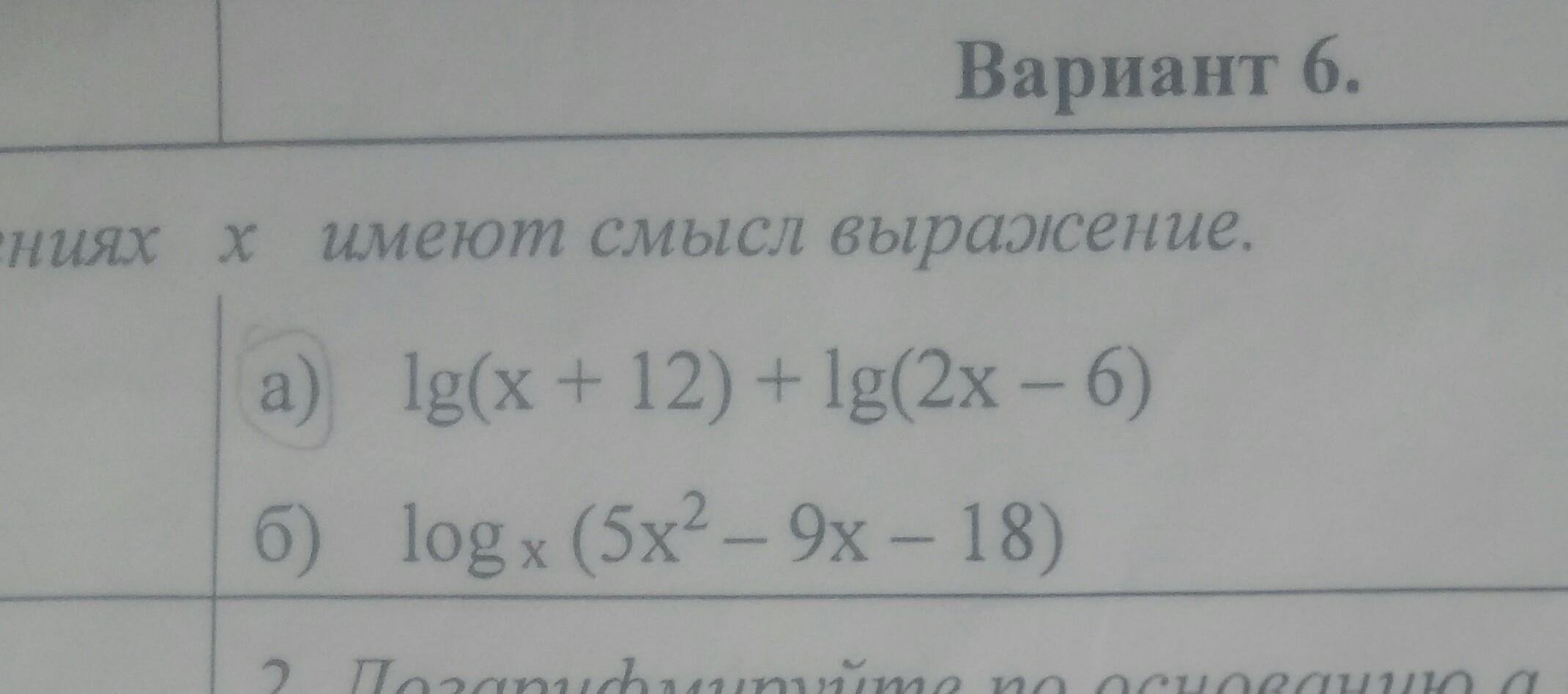 б) основание логарифма х≠1, x>0. 5x²-9x-18>0 решим методом интервалов. Приравняем левую часть к нулю и решим уравнение. 5x²-9x-18>=0.