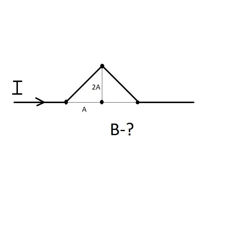 Первая и последная часть никакая индукция в точки, где мы ее ищем, не создают посколько точка лежит на направляние проводника. А вот вторая и третья часть проводника (они под неким углом) - по отдельности магн. индукцию создают, но они равны по модулю и направлены в противоположные стороны. Можно просчитать В2 (индукция, которая создаеть вторая часть проводника). В2>0 и направлена к чертежу. Просчитаем и В3 (индукция, которая создаеть вторая часть проводника). В3 тоже >0 и В3=В2 по модулю, так как такова геометрия картинки, но В3 направлена от чертежа к наблюдателю и значить, если В2 и В3 векторно сложить, то их сумма = 0 (нулевой вектор). А модуль нулевова вектора всегда = 0. :)