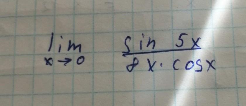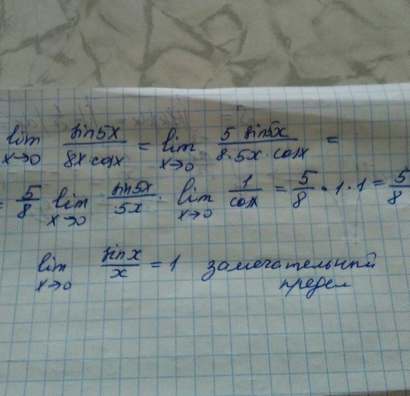 lim x->0 ((sin5x)/(8x*cosx))= lim x->0 5x/(8x*cosx)= lim x->0 5/(8cosx)= {подставим в х=0} = 5/(8*1)= 5/8
